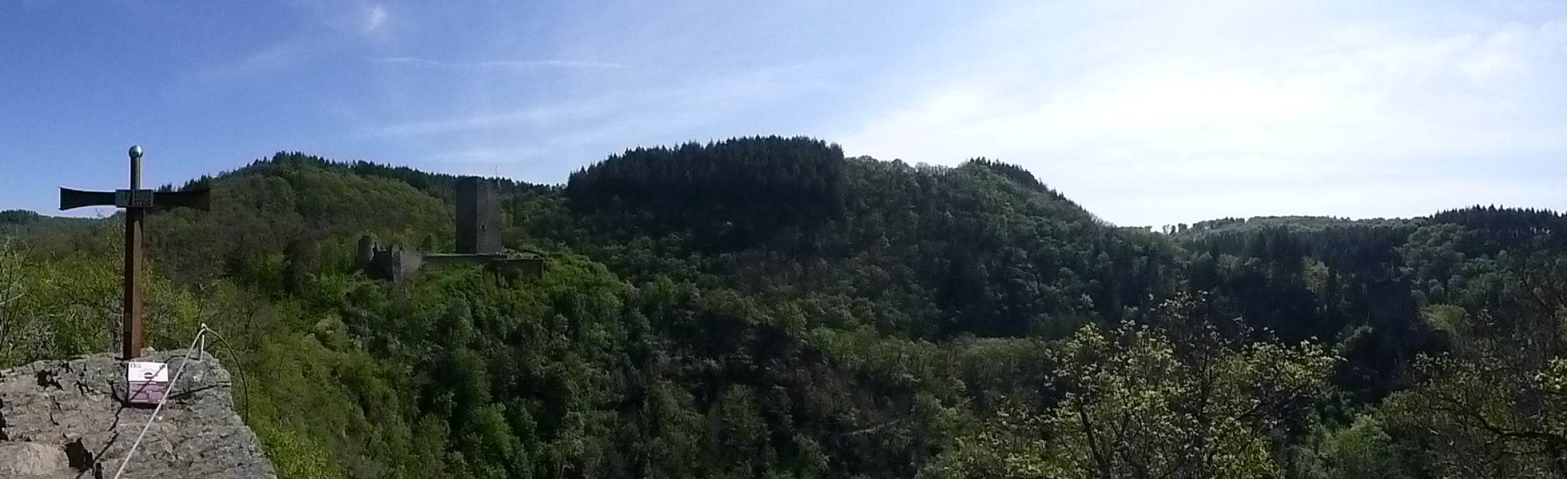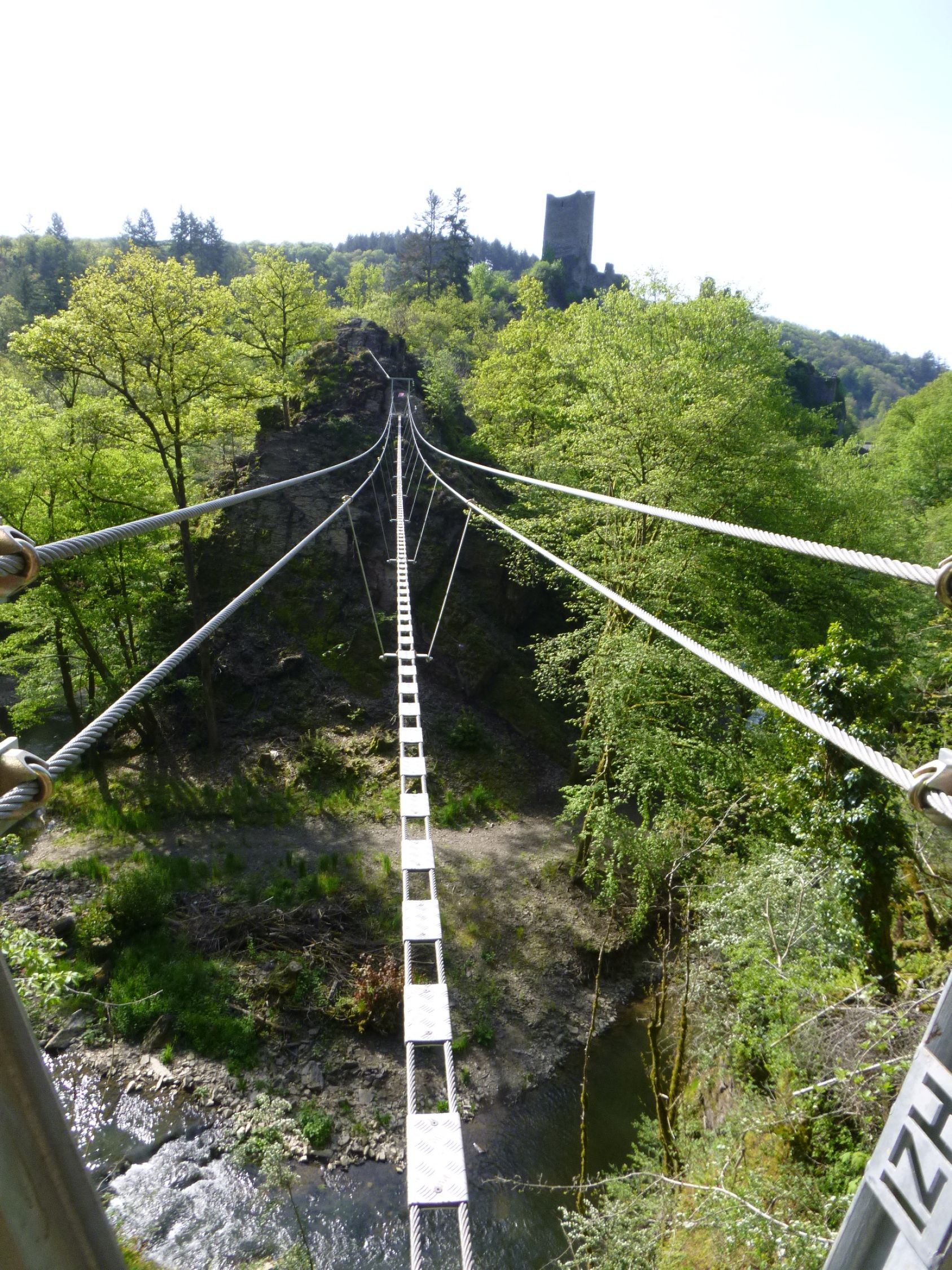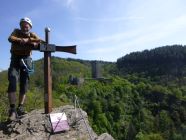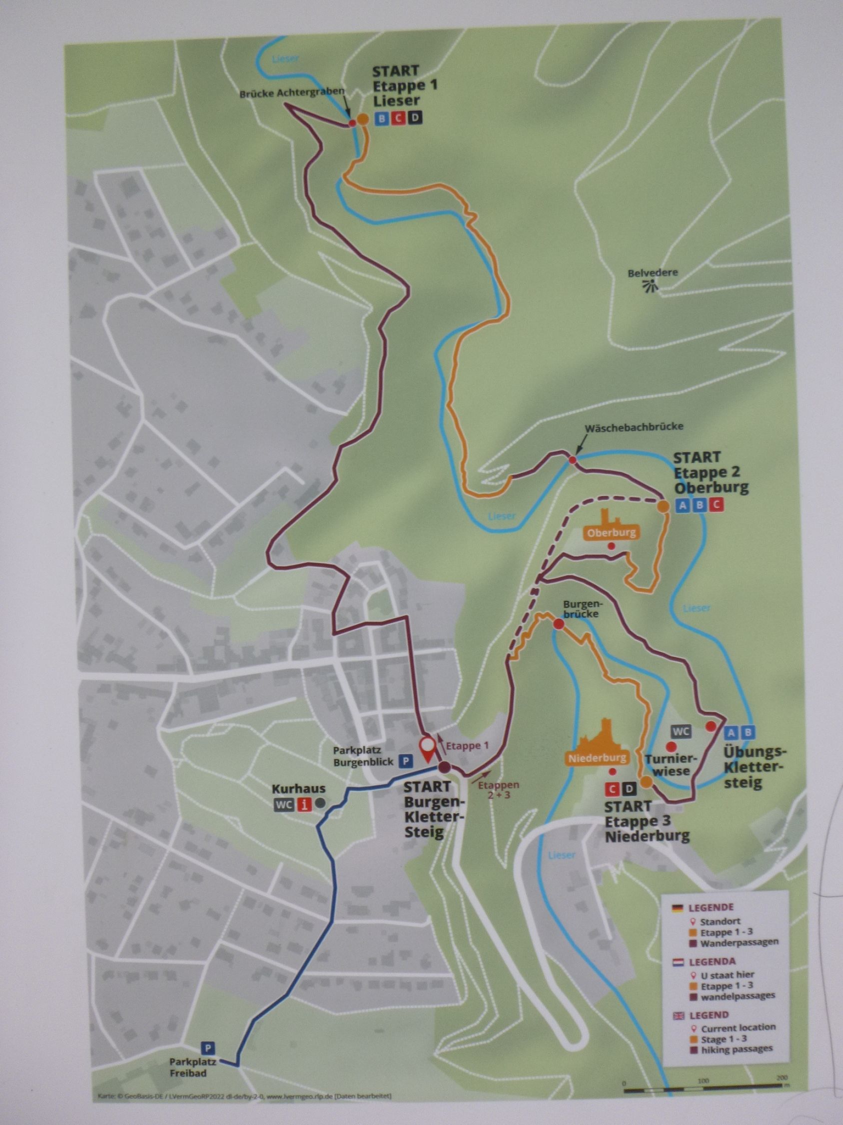 Auf dem Rückweg durch das Örtchen sah ich über 70 Klettersteigler aus verschiedenen Ländern in Richtung Einstieg pilgern. Bleibt zu hoffen, dass so ein Massenansturm auch den höheren Ansprüchen in der 3. Etappe genügen kann. Alle Parkplätze waren überfüllt. Parkplätze in Manderscheid beim Sonneck und in Niedermanderscheid bei der Niederburg kosten € 4,00 am Tag.