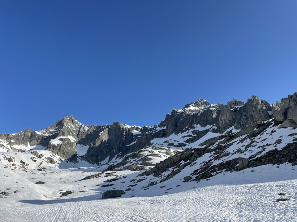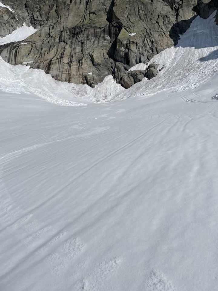 Das war heute eine kleine Tiefenbach-Safari mit Irrungen und Wirrungen. Start um 06.15 in Tiefenbach, der Schnee schwindet rasch, ich musste bis 2400 Ski tragen. Dann anfellen und Richtung Chli Bielenhorn steigen. Der Schnee war ab 2400 gefroren, aber die Sonne hat viel Kraft! Ich musste einsehen, dass ich zu spät oben wäre und dann keinen Firn mehr hätte. Daher Planänderung und das kleine Täli zwischen Gletscherhorn und Winterstock aufgestiegen bis zum Fels, also etwa 2720-2740 MüM. Dort war noch länger Schatten und der Firn tipptopp. Schöne Rast, für mich eine der schönsten Landschaften der Alpen. Abfahrt um 09.00 oben perfekt al dente, weiter unten ordentlich bis gut, und zum Abschluss dann wieder lange Skitragen…