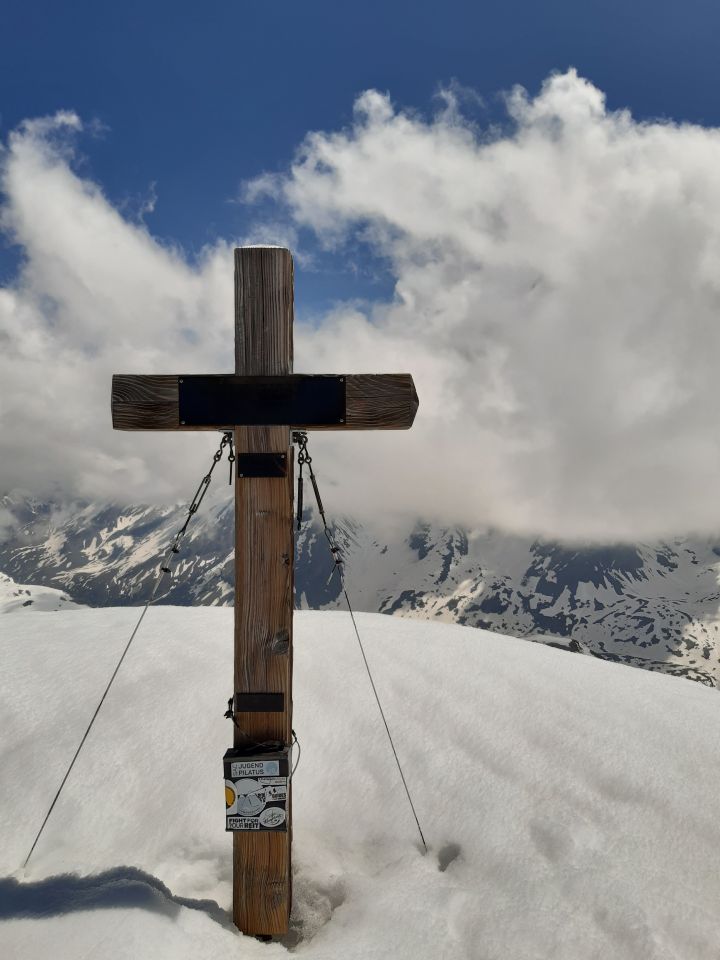 Noch genug Schnee ab Gemmipass, wenige apere Stellen zu überwinden morgens Hart tragend dank genug Abstrahlung über Lämmernboden holpriger Sommerschnee Steilstufe danach noch knapp Schnee, Skier hochgeladen, abwärts gerutscht dann zum Gipfel gut eingeschnitten und in der Abfahrt seidenen Sulz bis 2506m hinunter um etwa 12 Uhr, Rückweg über Lämmernboden mühsam zu schieben, Gemmibahn und Hotel offen