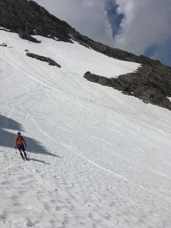 Tragen vom Raddepot am Bach bis zur Stelle, an der der Sommerweg den Bach wieder überquert. Danach 2 mal abschnallen bis Gipfel. Der Schnee ist bereits relativ fortgeschritten in Sommerschnee umgewandelt.