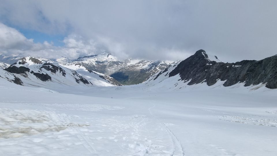 Muttgletscher noch hart, unten wellig mit Regenrillen, weiter oben dann schön eben und hart. Im Aufstieg durch die Nordflanke guter Trittschnee... noch bretthart gefroren.