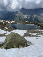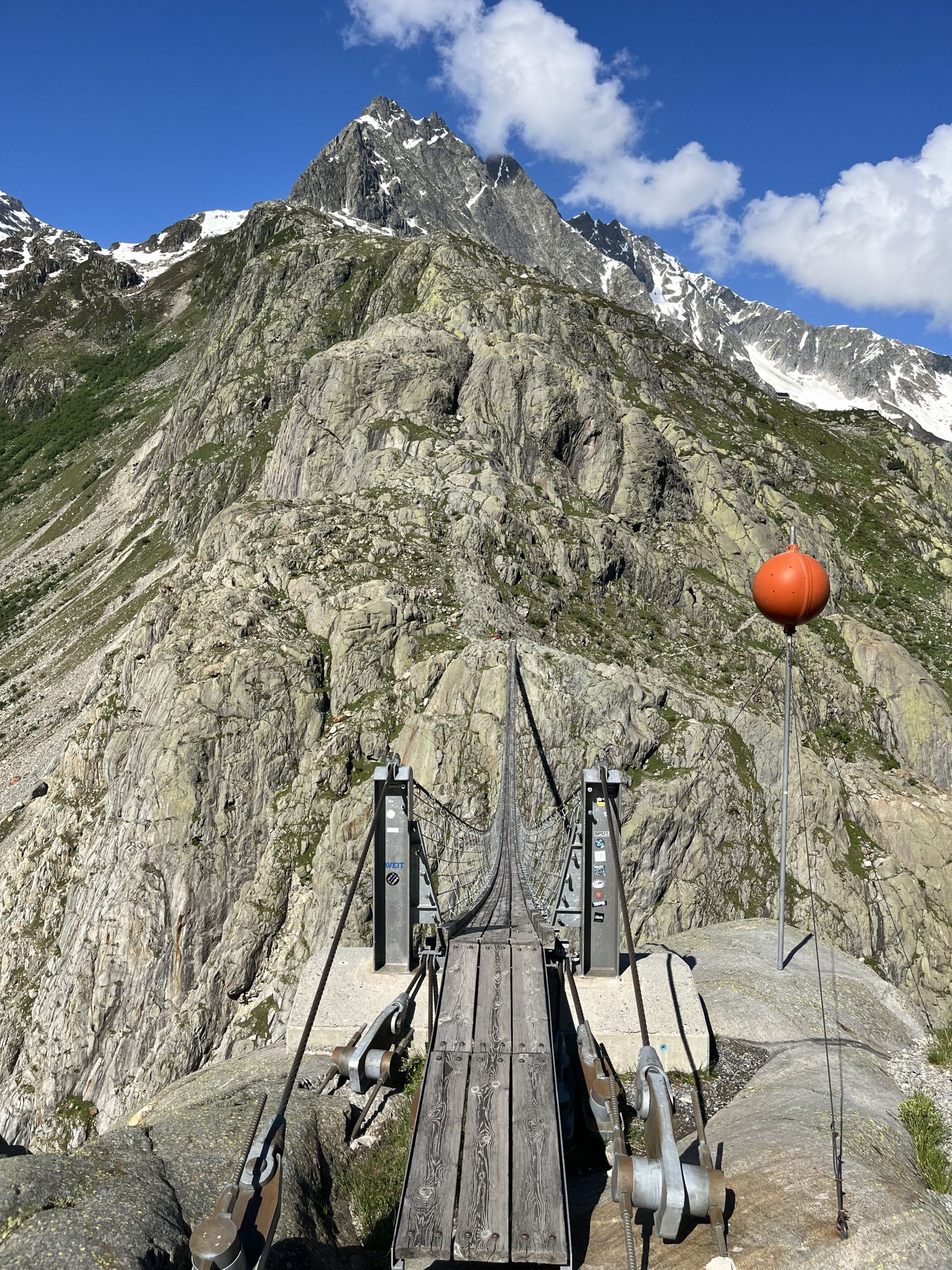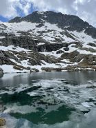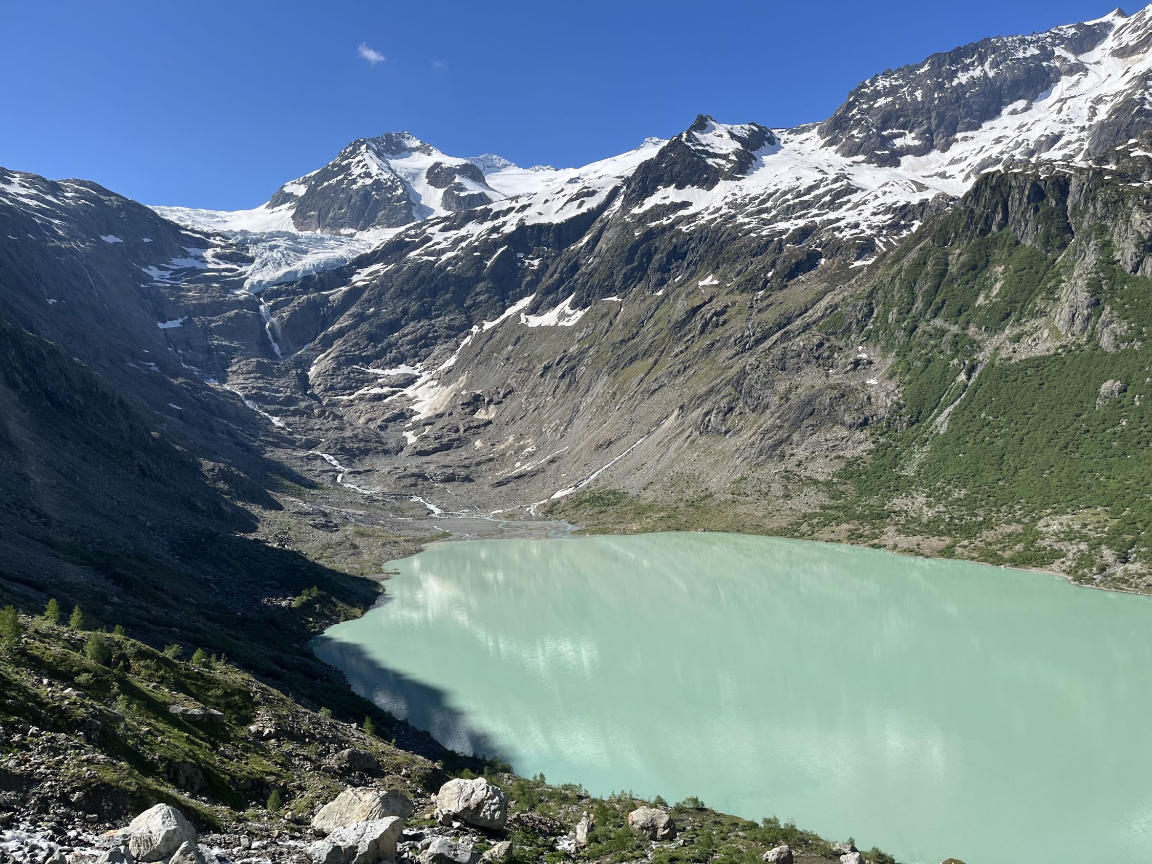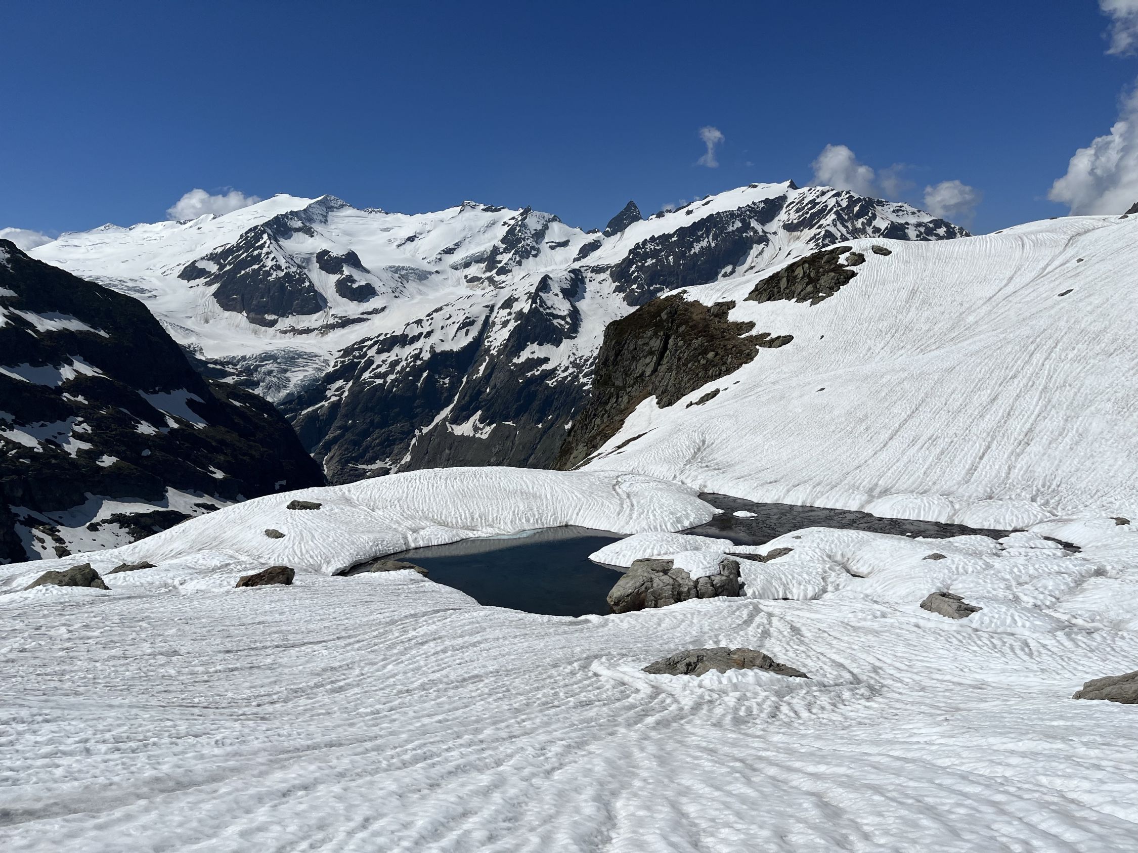 Altschnee im Drosi ab etwa 2300 m, tragend aber etwas weich. Nordseitig Schnee fast bis zum See, gut rutschbar. Für einmal kaum Betrieb an der Triftbrücke.