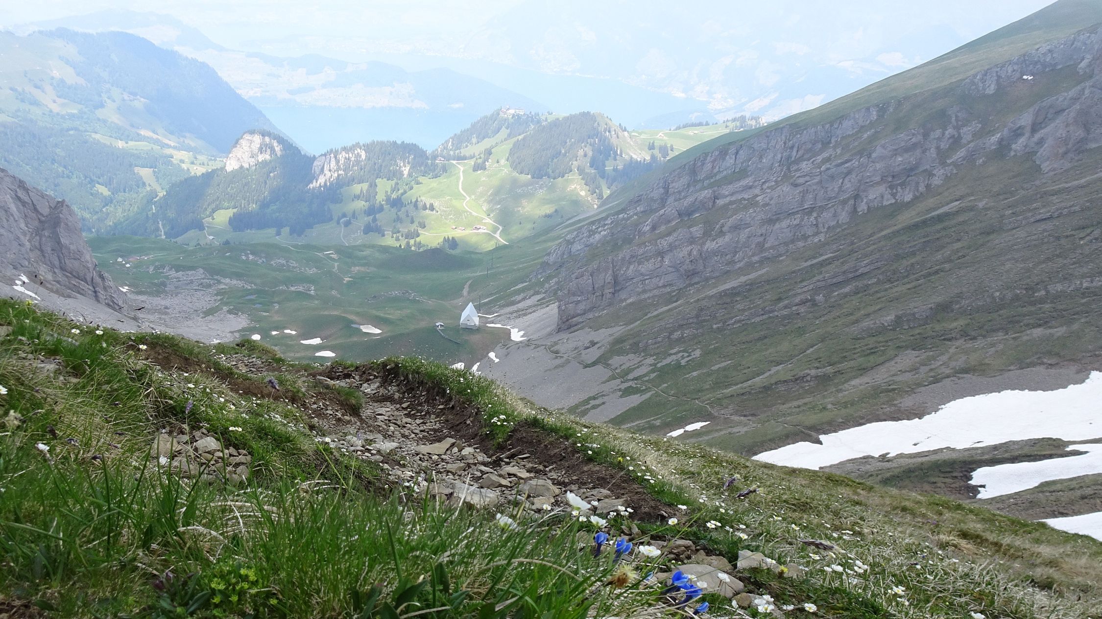 Glattgrat und Risetenstock schneefrei. Im Abstieg vom Hinter Jochli noch ein grosses Schneefeld. Geht aber gut mit vielen Spuren und weichem Schnee.