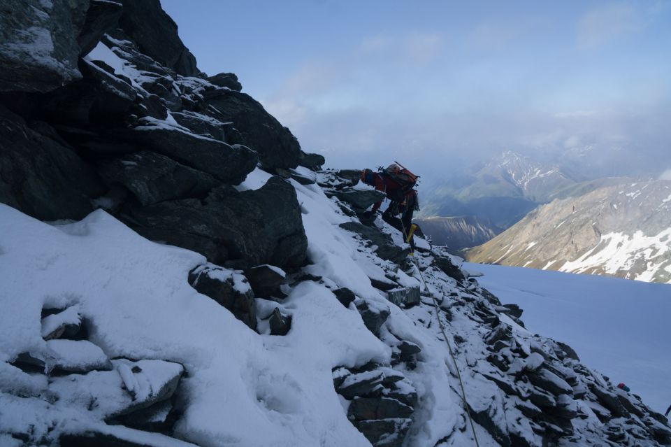 5:30 Uhr los, per Direkteinstieg in den Grat. Gletscherzugang gut eingeschneit, was Wühlerei beim Ausstieg zum Grat im tiefen Schnee bedeutet. Die ersten SL dann auf nassem, stellenweise überfrorenem Fels, wenig später dann Schnee und Eis im Nebel sowie Schneefall bis zum Gipfel. Je nach SL war der Eispanzer entweder hilfreich oder hinderlich. Einige Bereiche sind einfacher, wie z.B. die Hangelkante an einer Platte (III), wo man auf Trittfirn rechts der Platte aufsteigen kann. Andere Abschnitte sind eher ungemütlich. Dazu zählt leider die Schlüsselseillänge, wo man nach der Querung entlang des Stahlseils über einen immer morscher werdende Altschneeunterlage zum Grat aufgestiegen werden muss. Bei uns kam trotz mittelprächtiger Kühlung durch den Nebel schon einiges spontan links und rechts die dortige Flanke herunter. Problematisch ist auch, dass sich diese SL weit oben befindet, man also kaum Chancen hat, wirklich frühzeit diese hinter sich zu bringen. Meinem Seilpartner sind zudem zwei Schneegrate unter den Füssen weggebrochen, was nur einmal zu einem 1m-Rutscher in die Flanke führte. Wir haben daher zusätzliche Zwischensicherungen mittels Keile/Friends/Schlingen verwendet und haben so am Ende dank Nebel/Schnee/Eis/Zusatzsicherung bis zum Gipfel 8.5h ab Start benötigt.