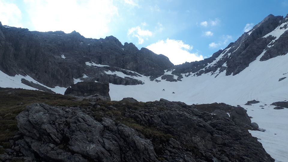 Aktuell sehr viel Schnee oberhalb ca. 2000m. Der Aufstieg zur Bockkarscharte ist ohne Steigeisen bei sicherer Gehtechnik machbar. Eispickel sehr hilfreich.