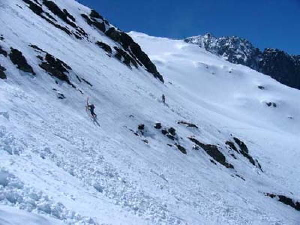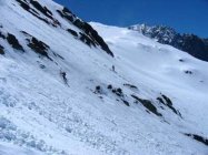 Gletscher ist gut verschneit, fast alle Spalten sind zu. Die Traversierung der Steilenhänge NW des Fil Liung kann bei Vereisung heikel sein.