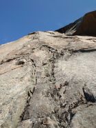 Was im Rockfaxführer mit "steady climbing (with spaced Protection)" beschrieben ist, entpuppt sich als "jubel und jauchz-Seillänge". So schön kann klettern sein! Nach dem ca. 8 bis 10m langen Run-Out werden die Placements wieder zahlreicher. Doch gleichzeitig auch die Griffe und Tritte grösser, so dass man das Steigen gar nicht unbedingt mit Friends legen unterbrechen möchte.