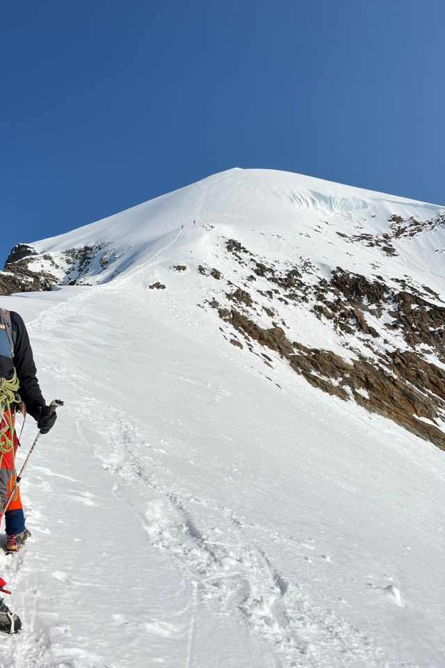 Abmarsch in Täschhütte 4:00 Uhr. Schnee ab ca. 3100m / Steigeisen ab ca. 3600m / Nase super für Auf- und Abstieg!