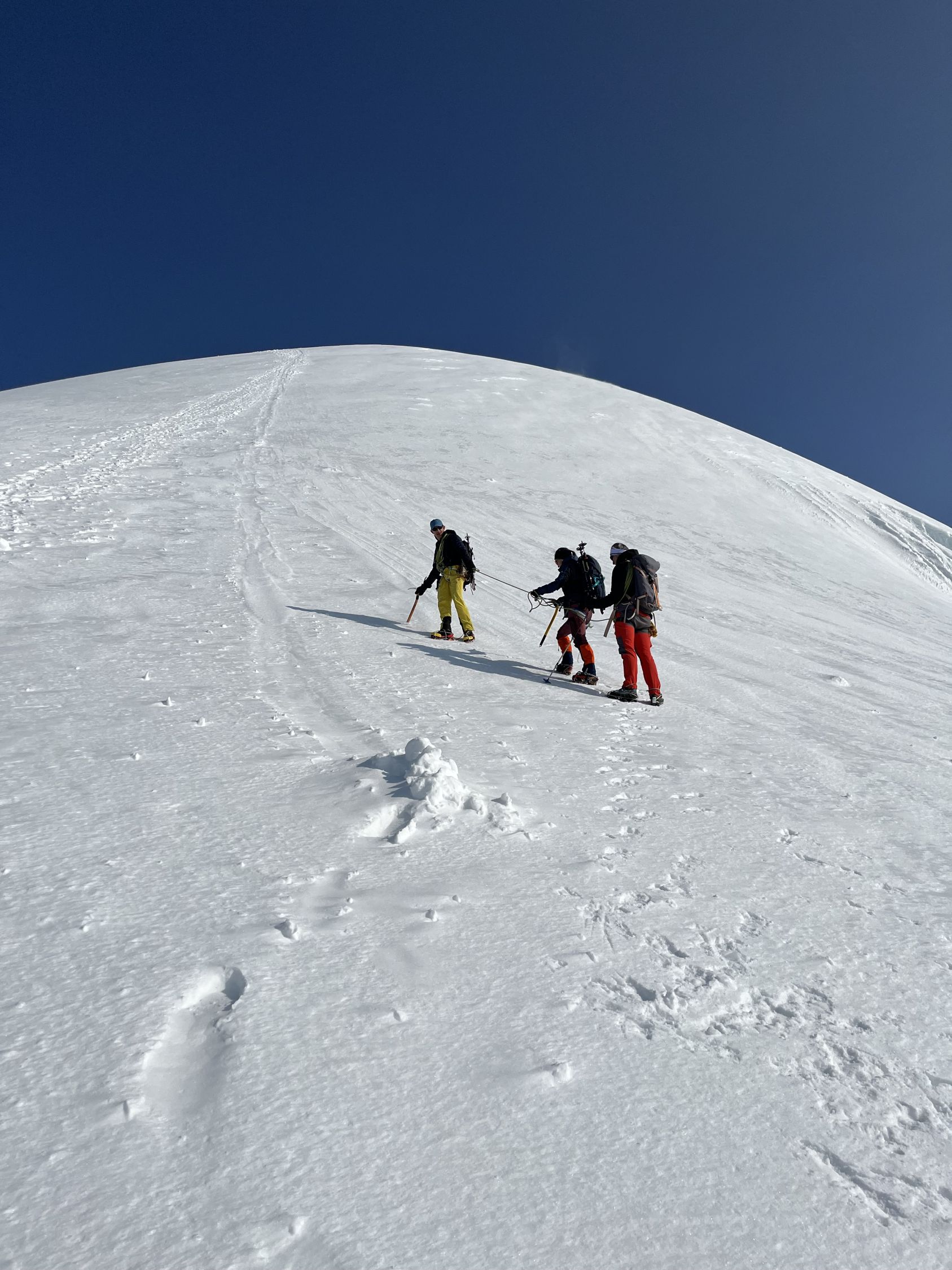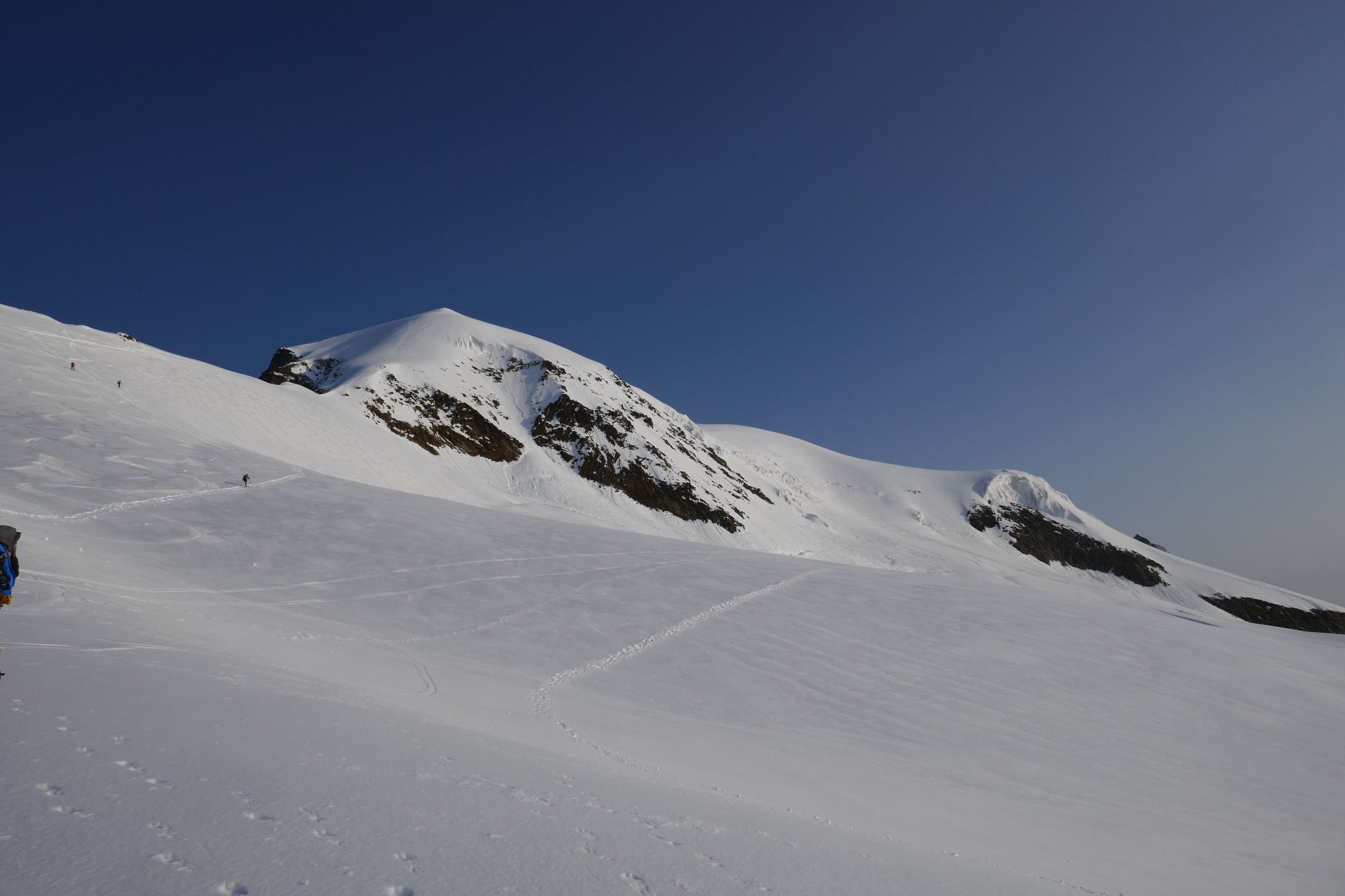 Wahnsinn wieviel Schnee noch in den Gräten liegt. Trotzdem hat es auch sehr viele Spalten auf den Gletschern in der Umgebung. Siehe Fotos!