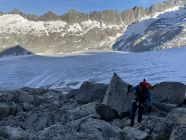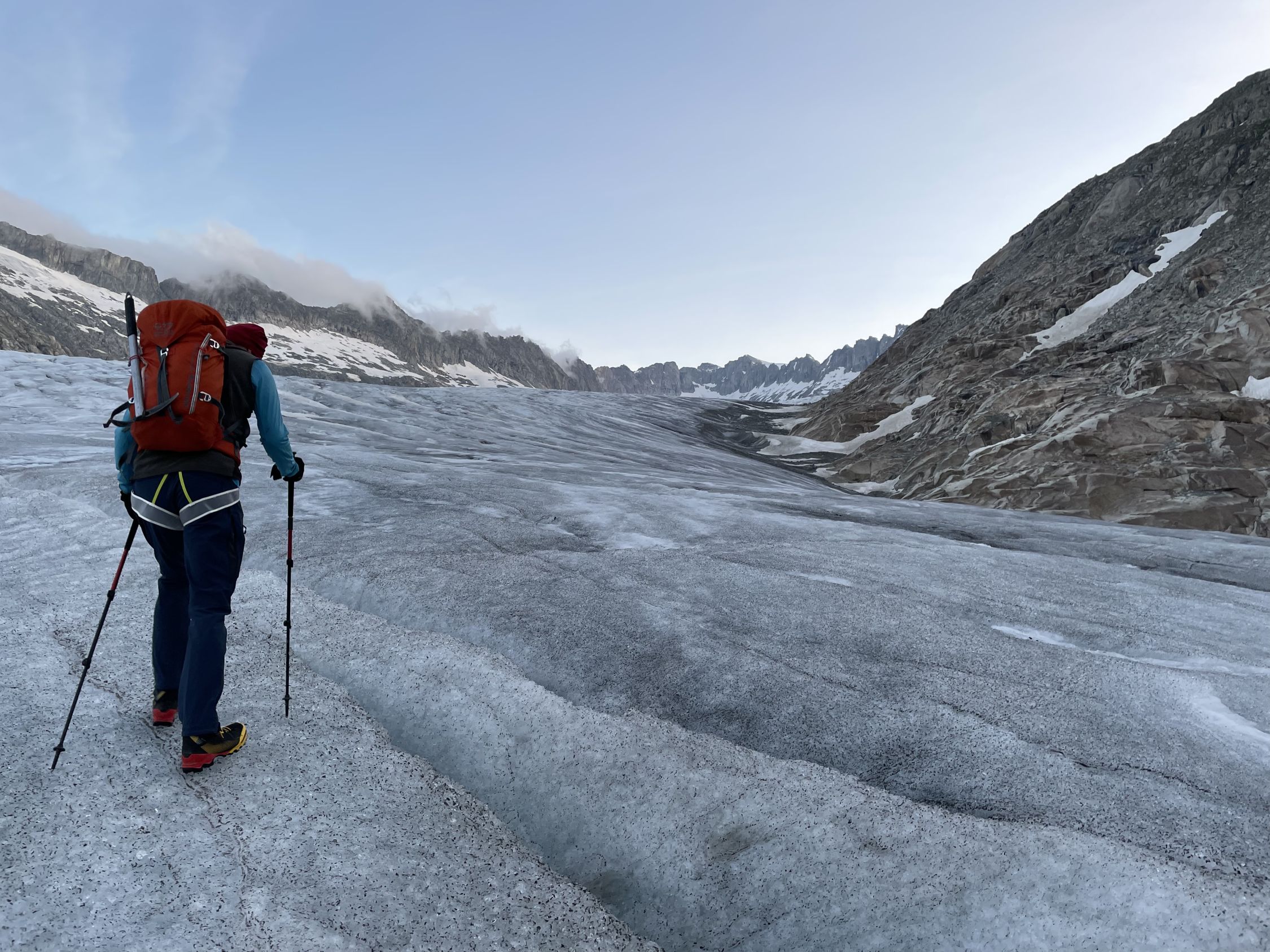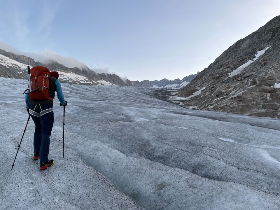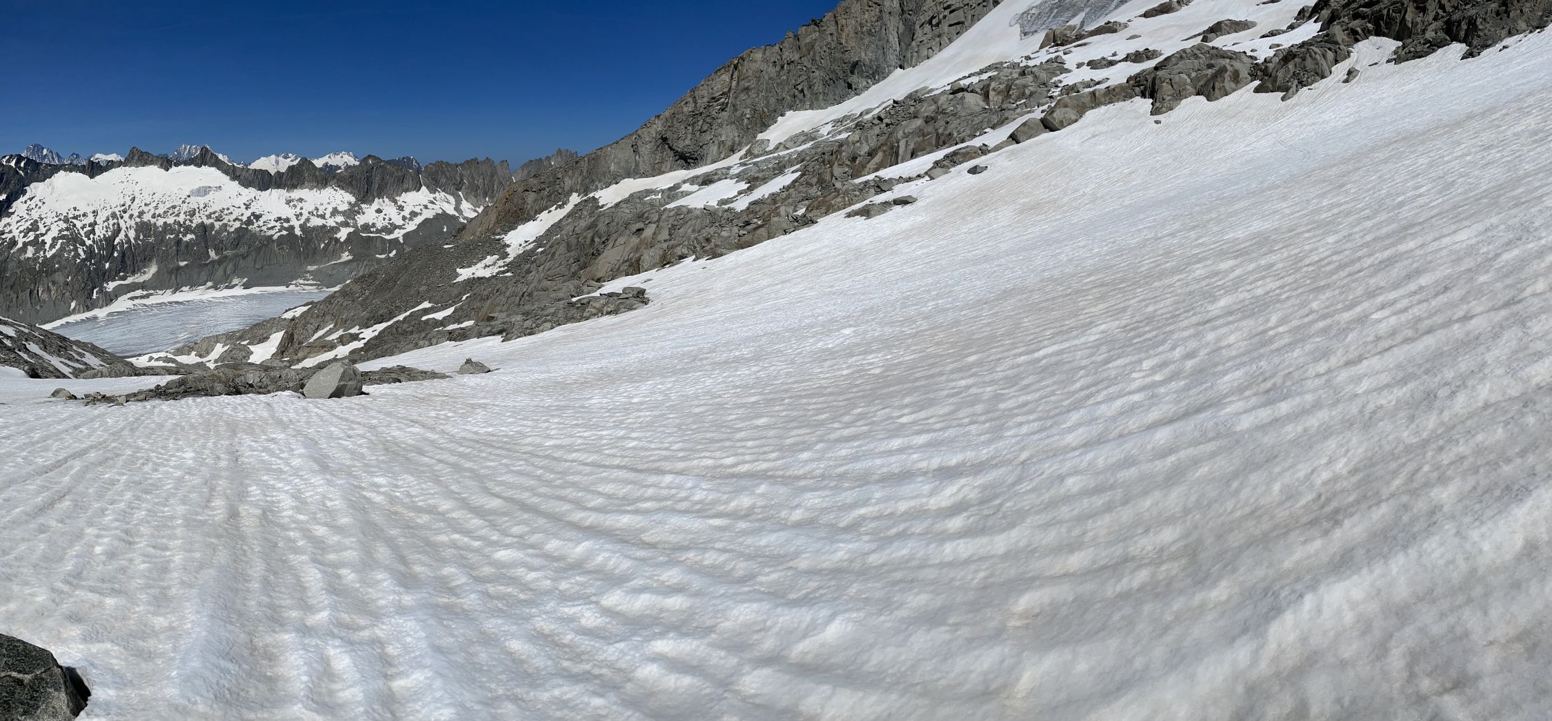 Der Rhonegletscher ist bereits bis etwa 2800m blank, lässt sich aber prima begehen. Die Spalten sind teilweise offen oder gut sichtbar eingeschneit.