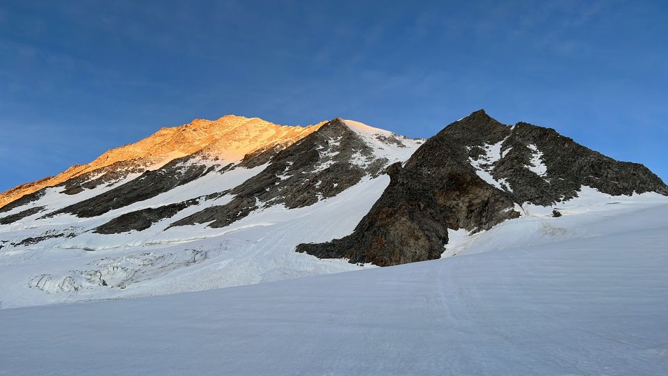 Viel Schnee auf dem Grat. Wir sind alles mit den Steigeisen geklettert. Gletscher hat gut getragen. Durch den vielen Schnee hielten sich die Stellen mit Bruch in Grenzen. Hütte ist Top. Ein großes Lob an die Hüttenwirtin Johanna und natürlich an meinen Guide Michi Stacheder von Mountain Elements. Vor uns war noch niemand. Jetzt gibt es eine Spur.