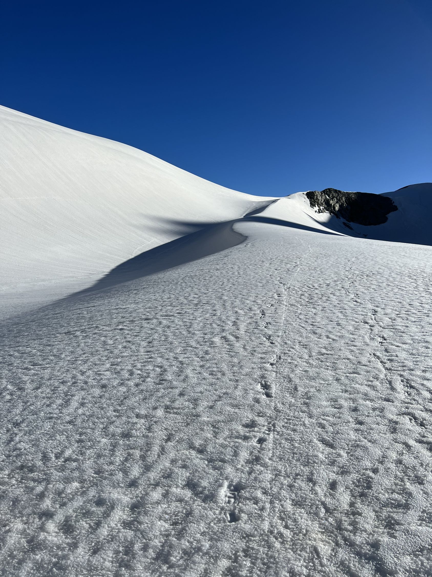 Eigentlich sind die Bedingungen grosse Teile der Route ausgezeichnet . Nur die steile Abwärtsquerung nach Bausatz ist deutlich anspruchsvoller und heikler als üblich. Mehrere steile Querungen müssen begangen werden. Morgens hart, ab Mittag heikler Sumpf mit Nassschneerutschen.