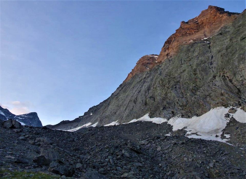 Start um 4.30 mit angenehmen Temperaturen. Auf ca. 2600m die ersten Schneefelder. Nicht ganz durchgefroren aber tragend. Auf dem weiteren Aufstieg auf die grünen Farbtupfer achten. Erleichtert den Aufstieg auf dem langen und aperen Felsenrücken bis zum Beginn des Gletschers. Ab hier mit Steigeisen auf tragender Schneedecke bis zum Pass und weiter bis Gipfel. Kurz vor dem Pass ab und zu eingebrochen da der starke Westwind die Schneedecke in der Nacht aufgeweicht hatte. Vor dem Pass Blankeis und unterhalb des Gipfels nochmals eine Blankeiszone. Starker Wind am Pass. Auf dem Gipfel dann ganz ok für eine Pause.