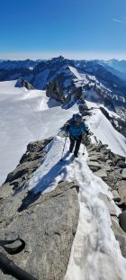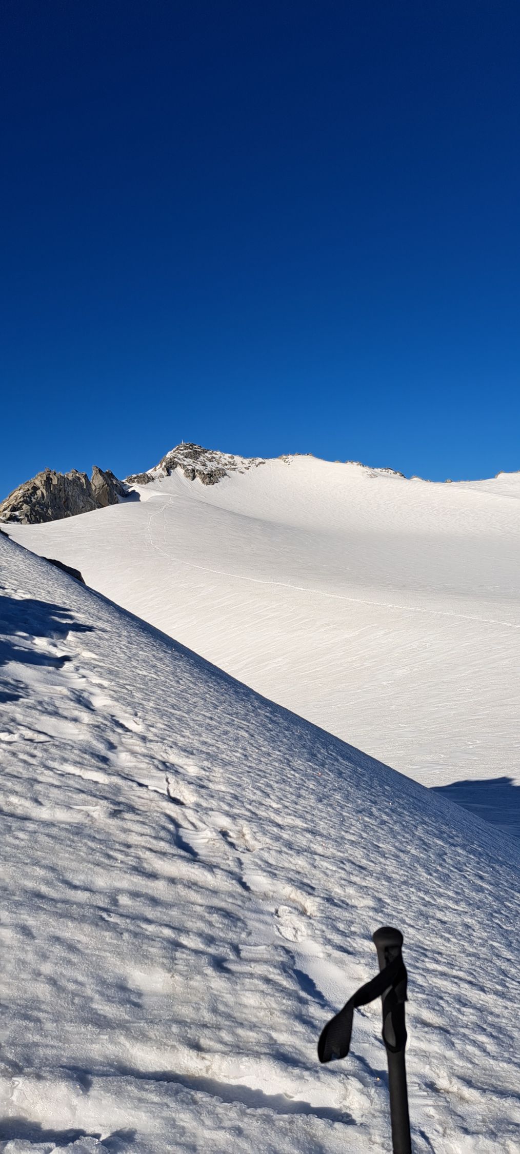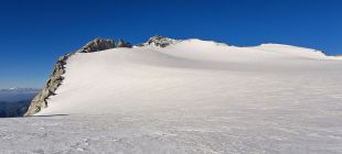 Anschliessende Gletscherpassage über noch komplett eingeschneiten, flachen Gletscher (max. 10 Grad) mit vorhandener Spur bis zum Beginn des kurzen Nordostgrates bei ca. 3310m. Aktuell keine Spalten sichtbar und problemlos ohne Hochtourenausrüstung machbar.