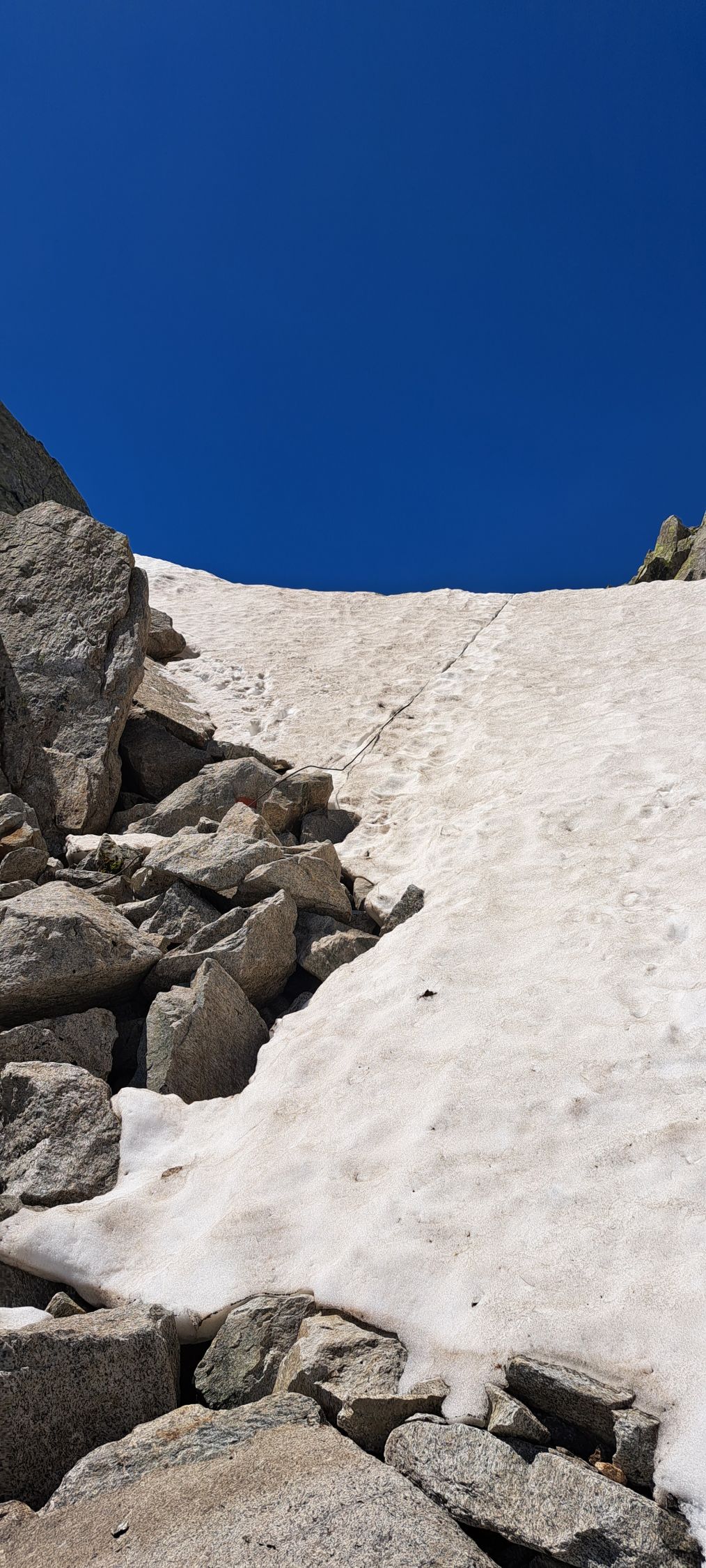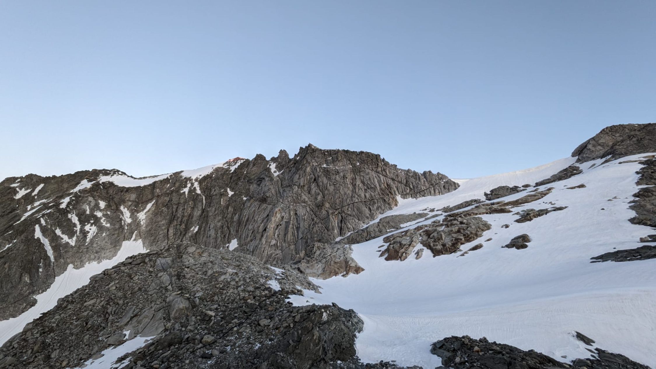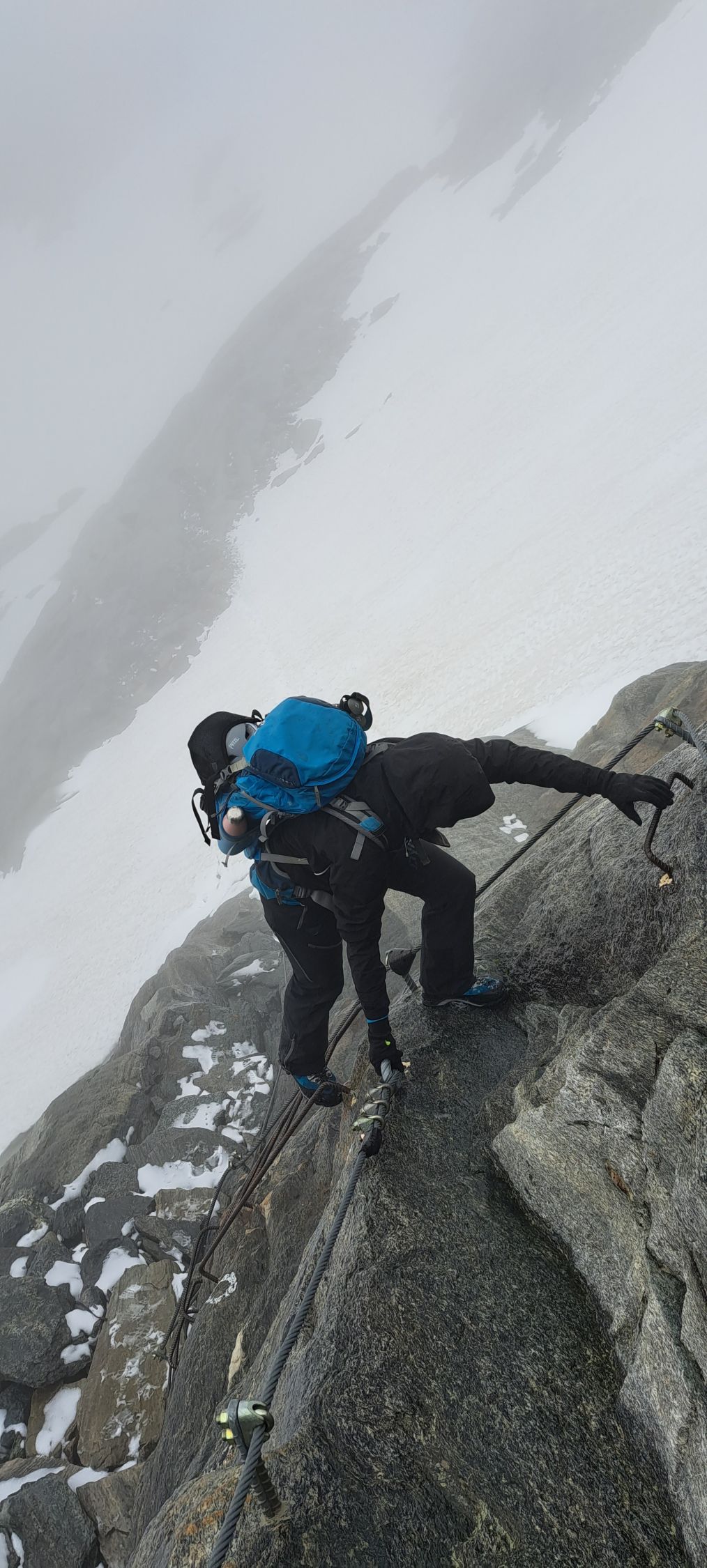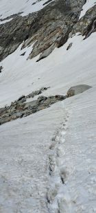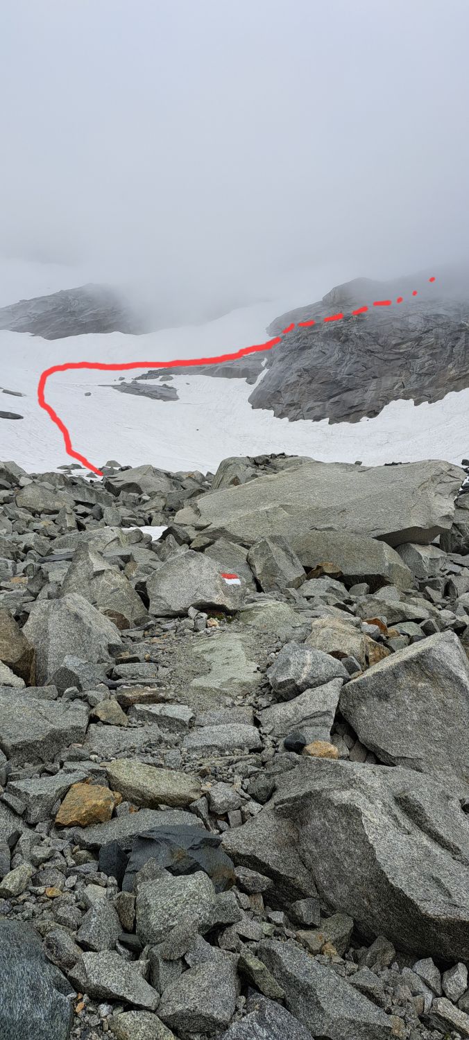 Im kurzen Zwischenaufstieg zum Grossen Tor aktuell noch zwei grössere Schneefelder, das zweite nur kurz unangenehm (seitlich abfallend 25 Grad). Direkt am Grossen Tor im Abstieg derzeit grosse Wechte (ca. 40 Grad steil), welche wir zunächst umklettert haben, aber im unteren Teil dann doch noch begehen mussten. Es liegt auch ein Stahlseil über der Wechte. Früh morgens sicher noch Leichtsteigeisen nötig. Weiteres Schneefeld welches umklettert werden kann. Anschliessend ab 2610m schneefrei und später folgt auf etwa 2300m nur noch ein kleines Schneefeld.