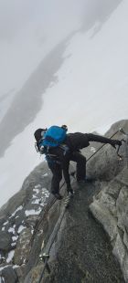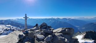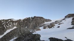 Im Blockgelände den gut gespurten, teilweise ausgesetzen und mit Altschnee bedeckten Gipfelgrat ebenfalls ohne Zusatzausrüstung begangen. Früh morgens insbesondere im Abstieg teils unangenehm und ggf. Leichtsteigeisen von Vorteil.