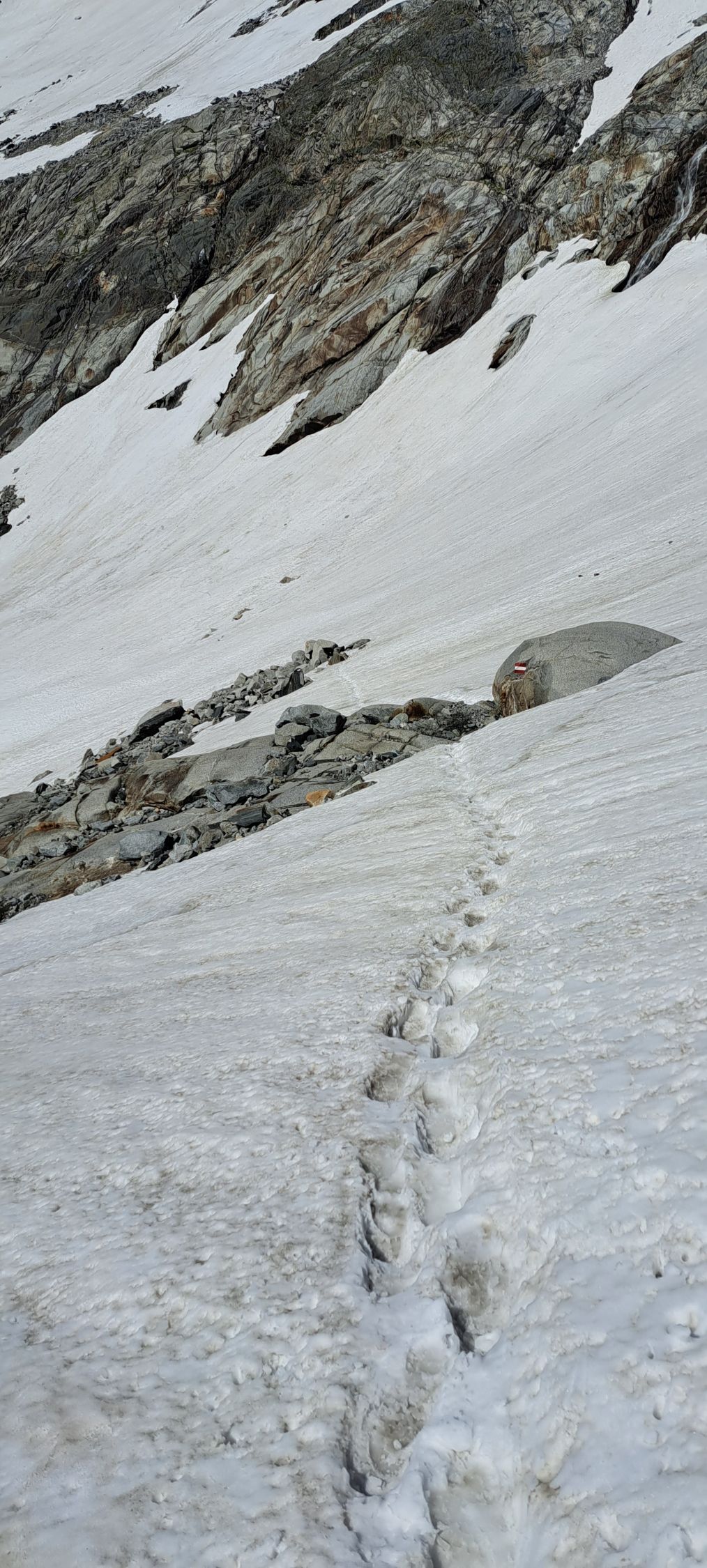 Ab ca. 2680m (Reste des Rotbachkees) noch grosses Altschneefeld bis zum Beginn der relativ kurzen seilversicherten, klettersteigähnlichen Passage (Schwierigkeit ca. Kat. B bzw. K2) auf 2780m. Weitere steilere Schneefelder (max. 35 Grad) bis in den Bereich der abgebrochenen alten Schwarzensteinhütte auf 2922m. Schneefelder gut eingetreten, früh morgens teilweise hart, nachmittags sehr weich. Bis zur Hütte ca. 4 Stunden (derzeit leicht erhöhter Zeitbedarf wegen Altschnee). Ggf. Leichtsteigeisen von Vorteil.