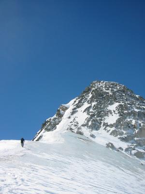 Aufstieg gegen 7 h gestartet mit bereits aufgefirntem Schnee. Spalten sind gut zugeschneit. Gipfel gut zu erreichen über leicht exponierte Gratkletterei; Abstieg und Abfahrt gegen 13 h über Aufstiegsroute; teilweise mühsam und tückisch in tiefem Sulz.