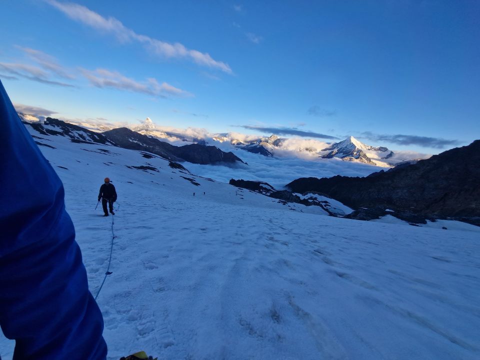 Bis 3400 m kommt man gut auf dem Wanderweg auf den Gletscher. Der Weg ist auch in der Nacht gut zu finden, nur oben heraus fast sumpfig. Der Gletscher ist gut zu gehen, die Spur ist fest. Abseits der Spur wird es aber schnell weich, wir hatten eine eher warme und bedeckte Nacht. Die Eisnase geht wunderbar ohne Sicherung, hat noch viel Firn.