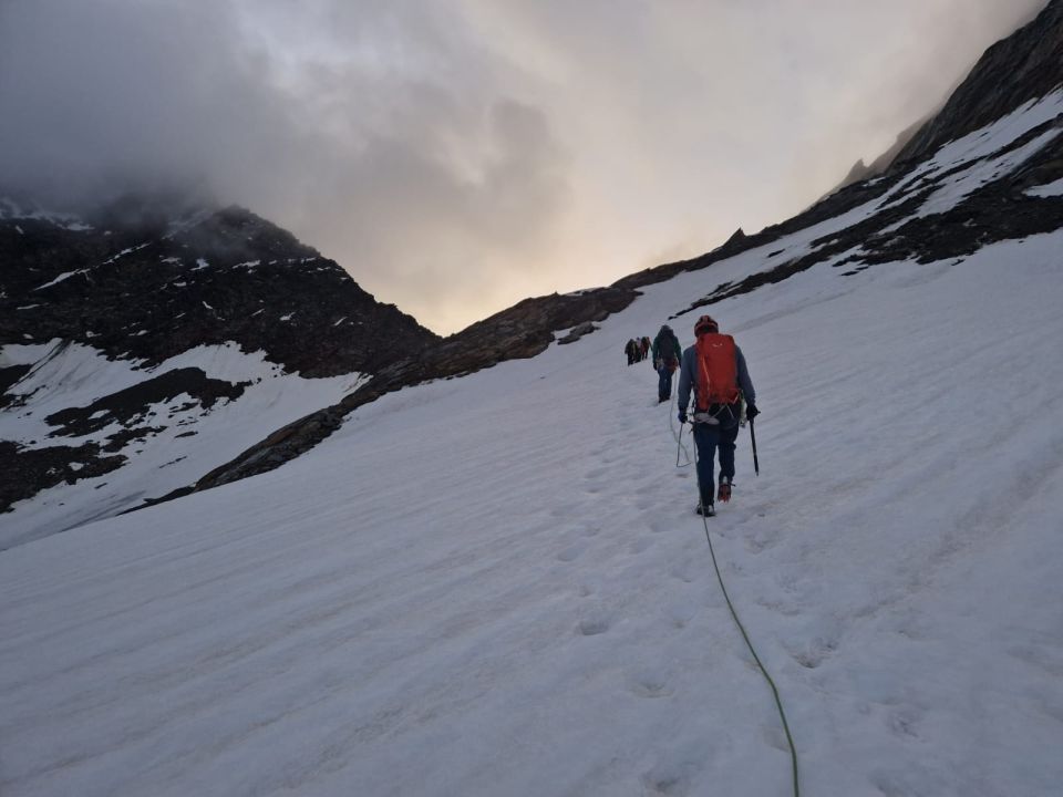 Trotz der noch nicht idealen Bedingungen ist die Route gut machbar (und macht eine Menge Freude), es waren insgesamt ca 10 Seilschaften unterwegs. Aufgrund der aktuellen Verhältnisse wird es sehr knapp, um 4:00 in der Hohlaubhütte zu frühstücken und bis zur letzten Bahn um 16:15 wieder zurück zu sein. Zumindest ging es uns so, dass wir die Bahn verpassten und bis Saas Grund absteigen mussten und auch einigen weiteren Seilschaften.