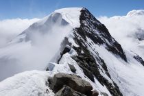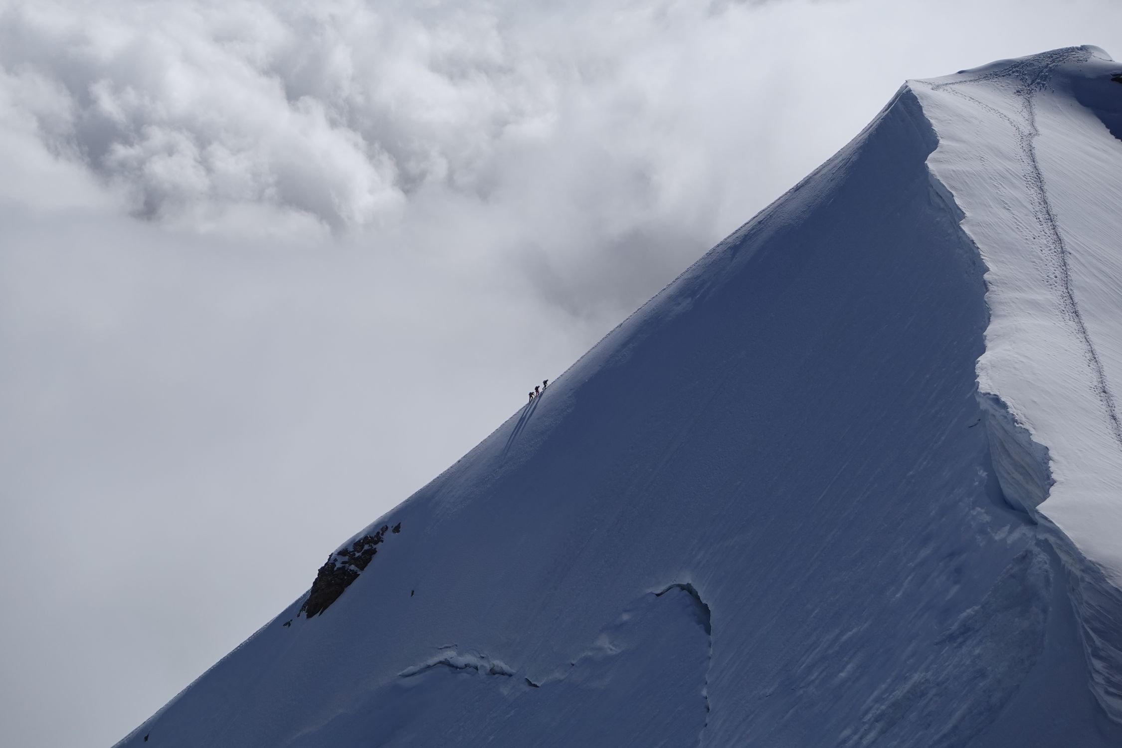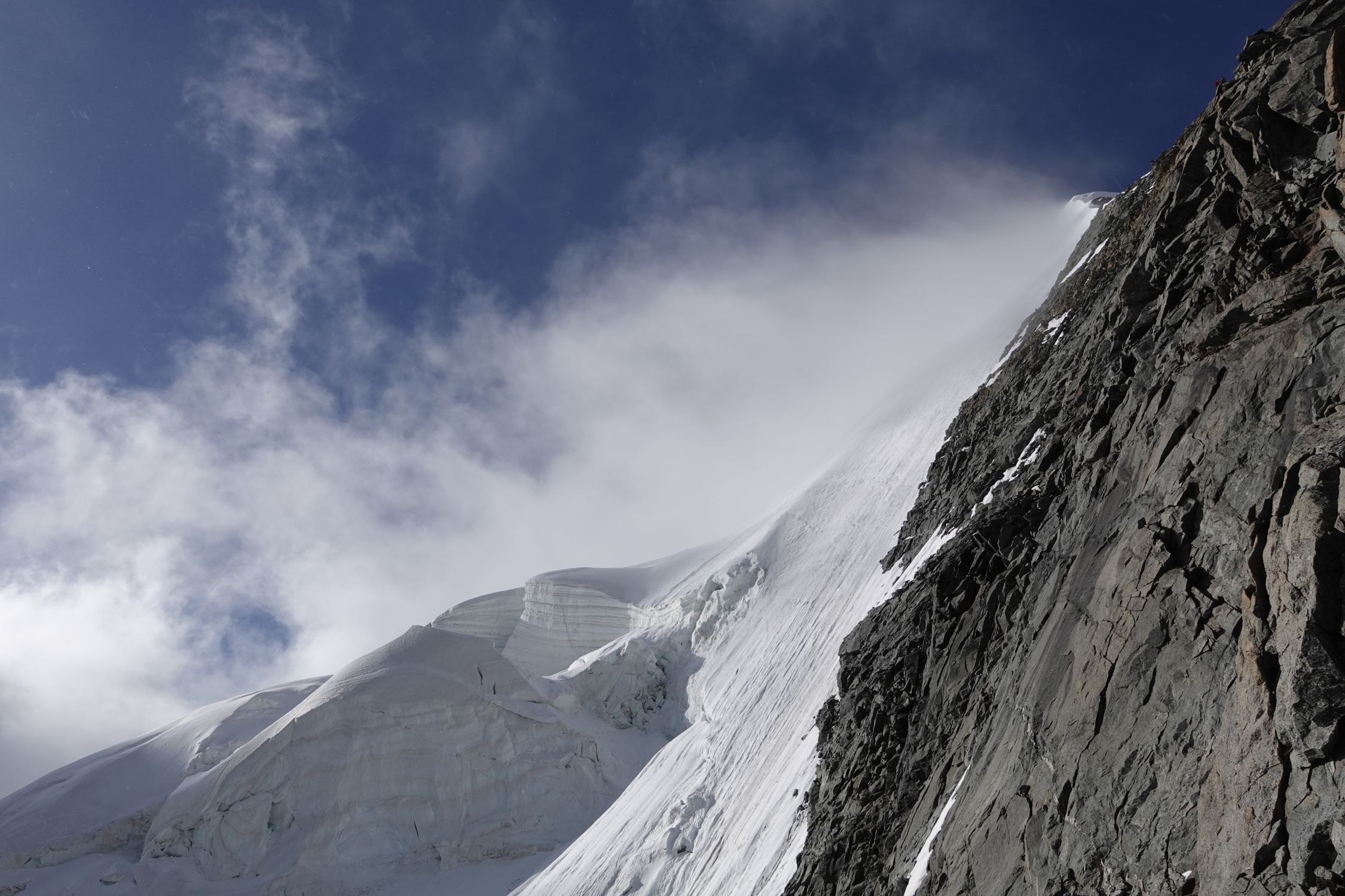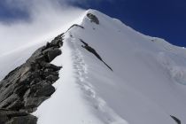 Spur (Normalweg) noch OK. Querung zum Einstieg problemlos, Übergang zum Fels problemlos, Fels trocken, Firnausstieg perfekt. Trotz nicht perfektem Wetter 15 Personen am Grat und Massen auf dem Normalweg.