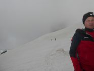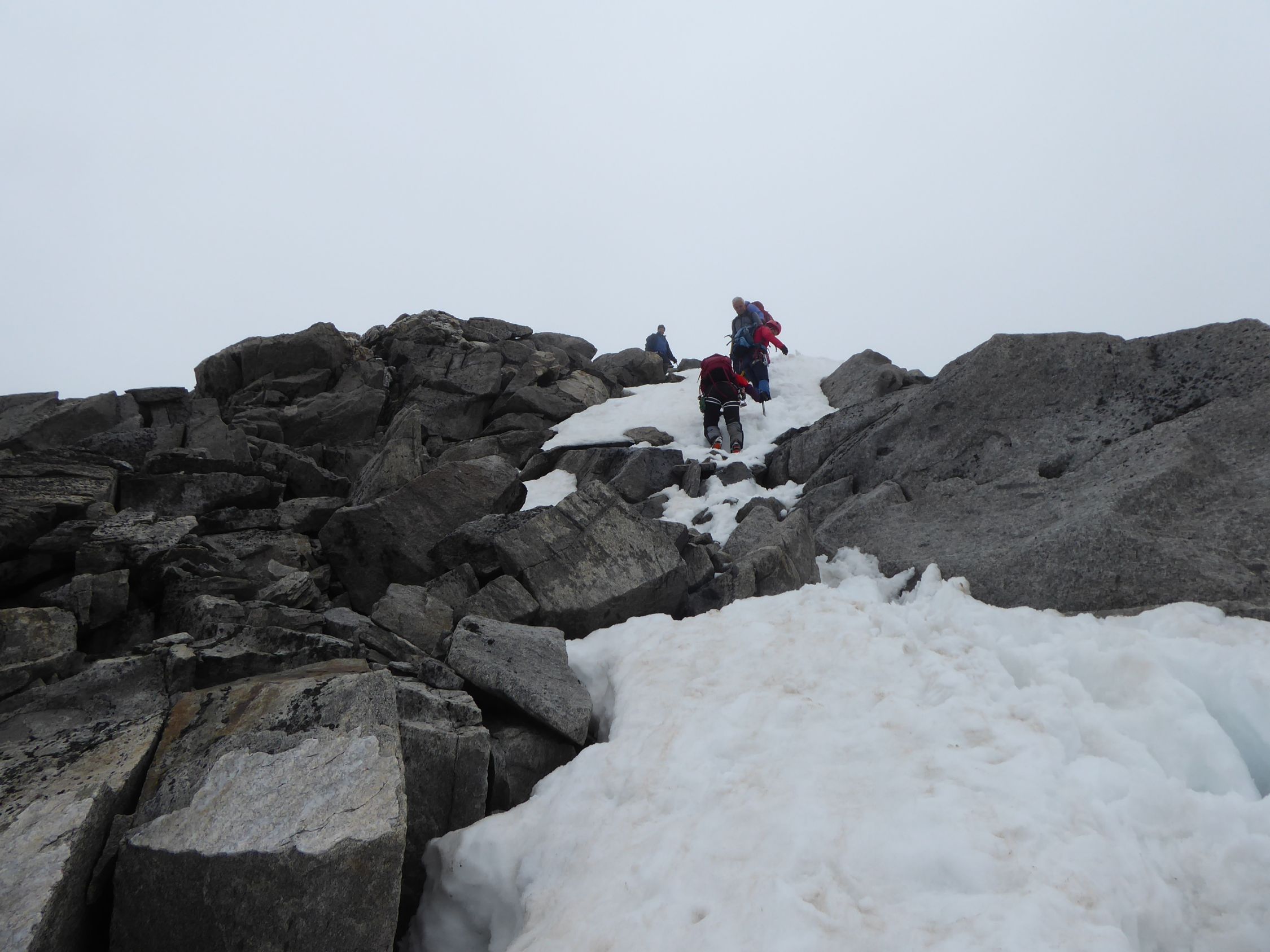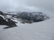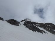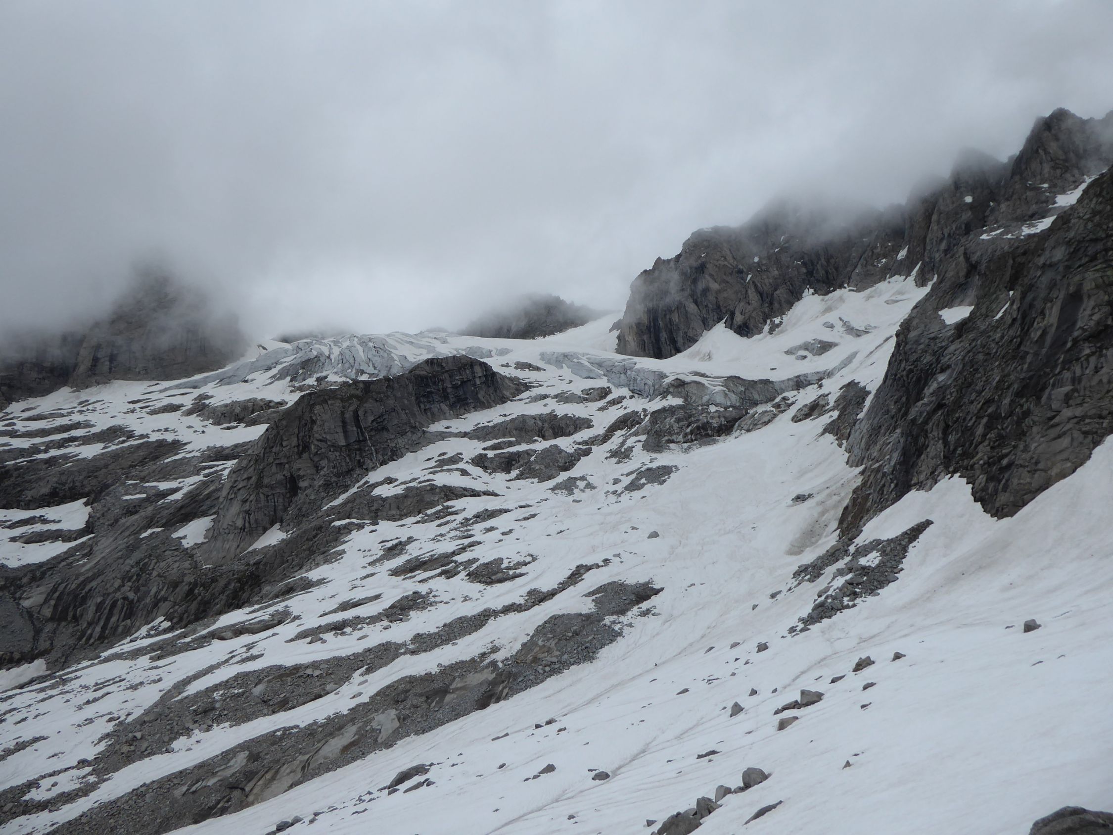 Bis zum Gletscher mit zunehmender Höhe immer mehr Altschneefelder, die am Nachmittag oftmals nicht mehr tragfähig sind. Gletscher im Moment noch gut eingeschneit, Firnauflage gut tragfähig.