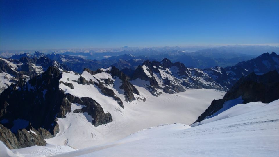 Gletscher tiptop eingeschneit. Ein paar kleine, schmale Spalten sichtbar. In der Flanke selbst deutliche Spuren von Eisschlag. Spur wird recht schnell weich, aber immer noch gut zu gehen. Aufstieg auf den Grat durch die Flanke gute und große Tritte (stellenweise schon Eiskontakt (2 Pickel sehr angenehm; wir sind hier auch wieder abgestiegen, was deutlich schneller geht als bis zur Abseilstelle vor der Breche Lory und dort abzuseilen), allerdings hält die Brücke über den Bergschrund nicht mehr allzu lange.