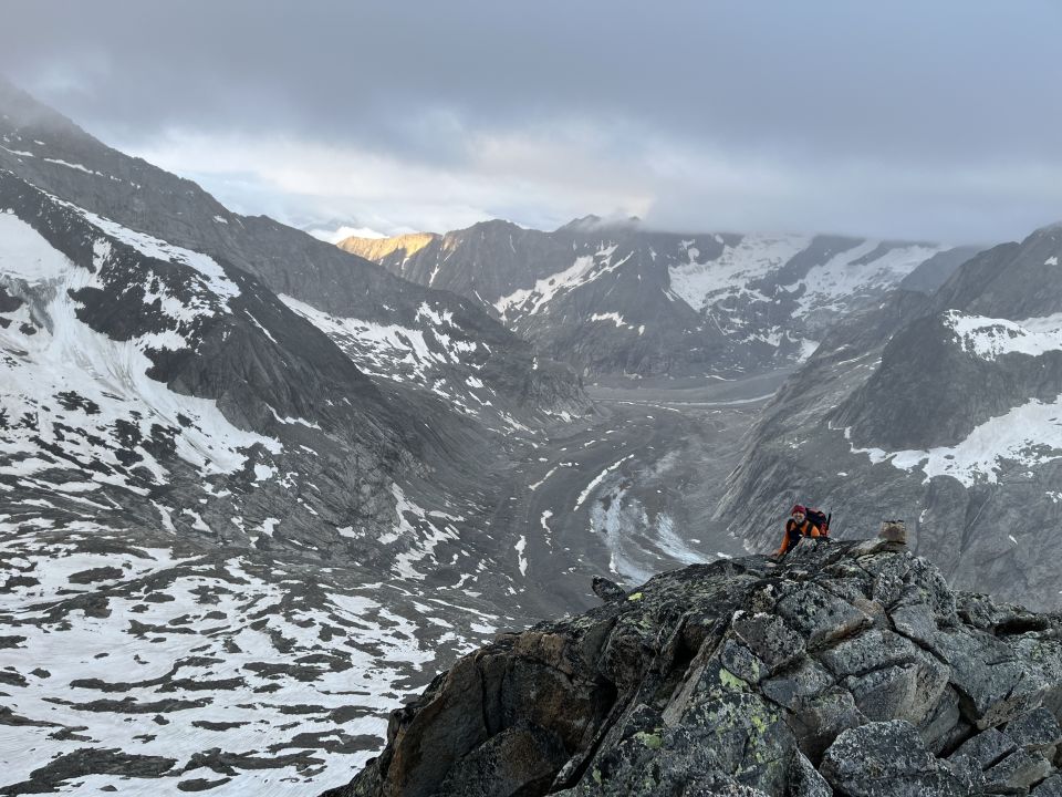Nach Durchzug einer kurzen Kaltfront am 01.07.23 derzeit grundsätzlich top Verhälnisse am Berg. Insgesamt ab Blockgrat eher winterliche Verhältnisse mit eis-/schneeüberzogen Felsen/Geröll und Schutt. Vor allem im oberen steilen Abschnitt der Route guter Trittfirn (Neuschneeauflage allerdings nicht immer ganz verfestigt, teilweise Bruchharsch und leichter Eisschlag durch absteigende Seilschaften). In den Couloirs z.T. etwas Triebschnee.