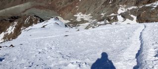 An der Bergstation Hohsaas (3142 m) absteigen bis man an einen kleinen Steig erreicht. Diesen Steig folgen bis zum Gletscher kommt. Der Schnee war top und so kann man gut auf den Grat. Ab ca 3600m beginnt dann der Schnee und die Steigeisen werden angelegt. Über schöne Serpentinen und weiterhin bei Superschnee( auch im Abstieg bis 11 Uhr) erreicht man bei heute guten Verhältnissen den Gipfel.