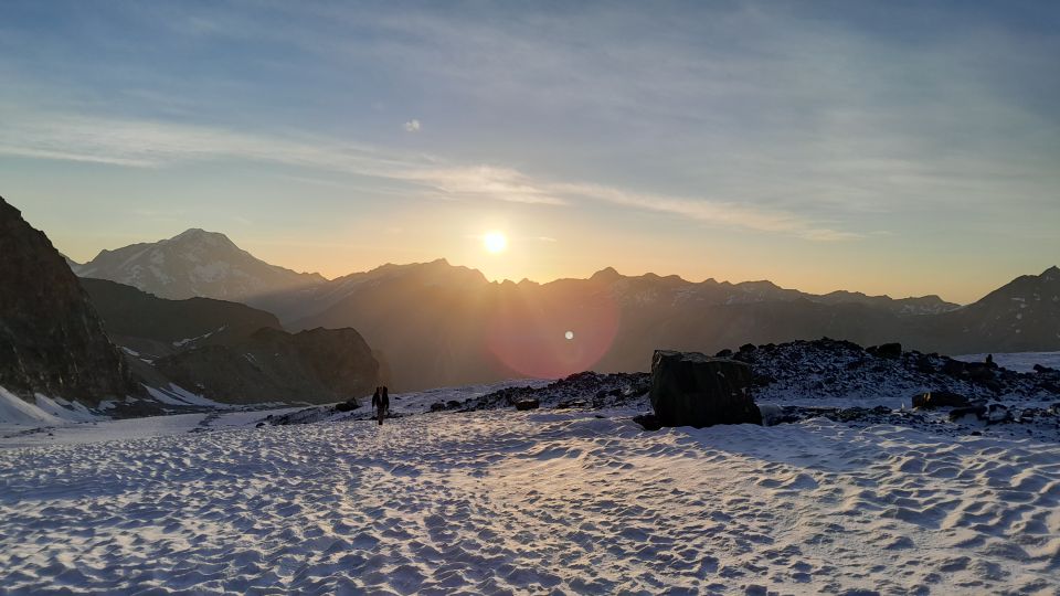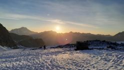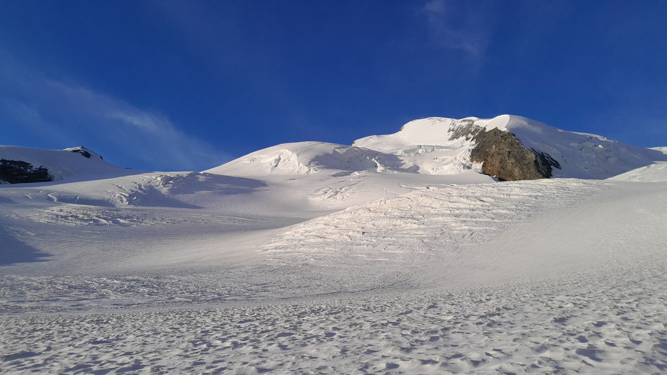 Gletscher im Aufstieg gut zu gehen oben noch gut eingeschneit. Im Abstieg wird es unten dann sehr weich bis sumpfig. Wir sind vom Mattmark Stausee am Vortag zum Schwarzbärgchopf und haben dort biwakiert.