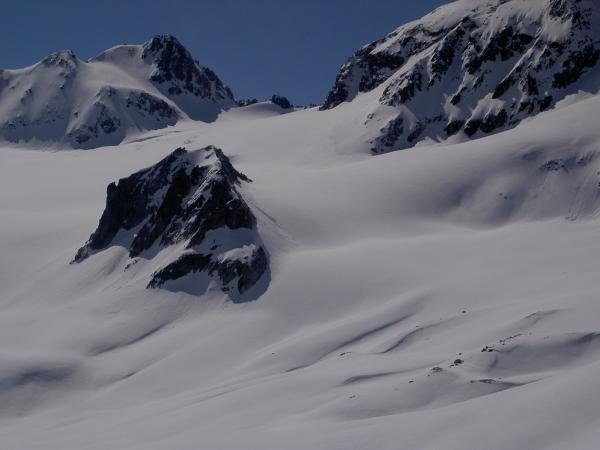 Dürrboden - Grialetschhütte - Isla Persa - NW-Wändli auf Piz Sarsura. Abfahrt über den N-Gletscher bis unter Isla Persa (Höhe 2550m) Aufstieg unter P. Grialetsch. Scaletta-Nord hinunter nach Dürrboden.