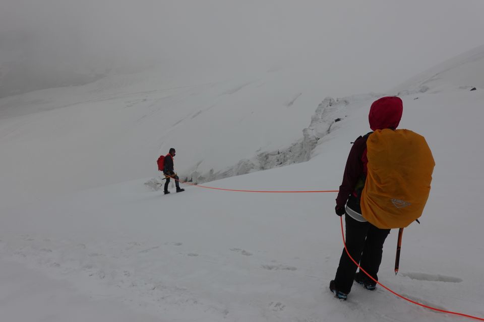 In der Nacht nicht gefroren, der Schnee war teilweise extrem sumpfig, vor allem im unteren Teil des Mellichgletschers. Dann Schlechtwetterfront von Westen mit Wolkenunterseite auf ca. 3.600 m. Dort dann umgekehrt. Abstieg über die Pfad „Vor der Wand“, der ist mit Steinmännern (oder sind es -Frauen?) gut markiert.