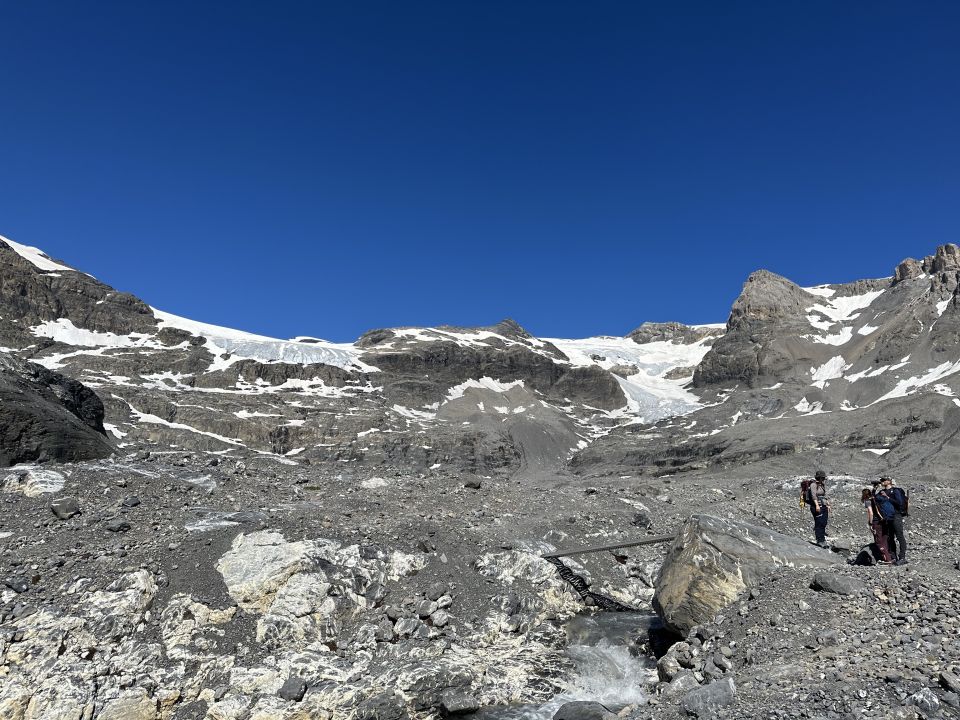 Gletscher hat noch gut Schnee, keine blanken Stellen auf der Route. Wegen der hohen Temperaturen war der Schnee sehr nass und in der Nacht nicht gefroren. Auf der Route diverse Spaltenlöcher sichtbar, die Schneebrücken sind durch die hohen Temperaturen auch nicht mehr immer zuverlässig.