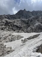 Schneefelder sind momentan kein Problem mehr, die Route ist frei. In den ersten drei Seillängen sind einige Bolts vom Steinschlag verbogen, hier helfen dünne Schlingen. Ab 4. SL ist alles in bestem Zustand.