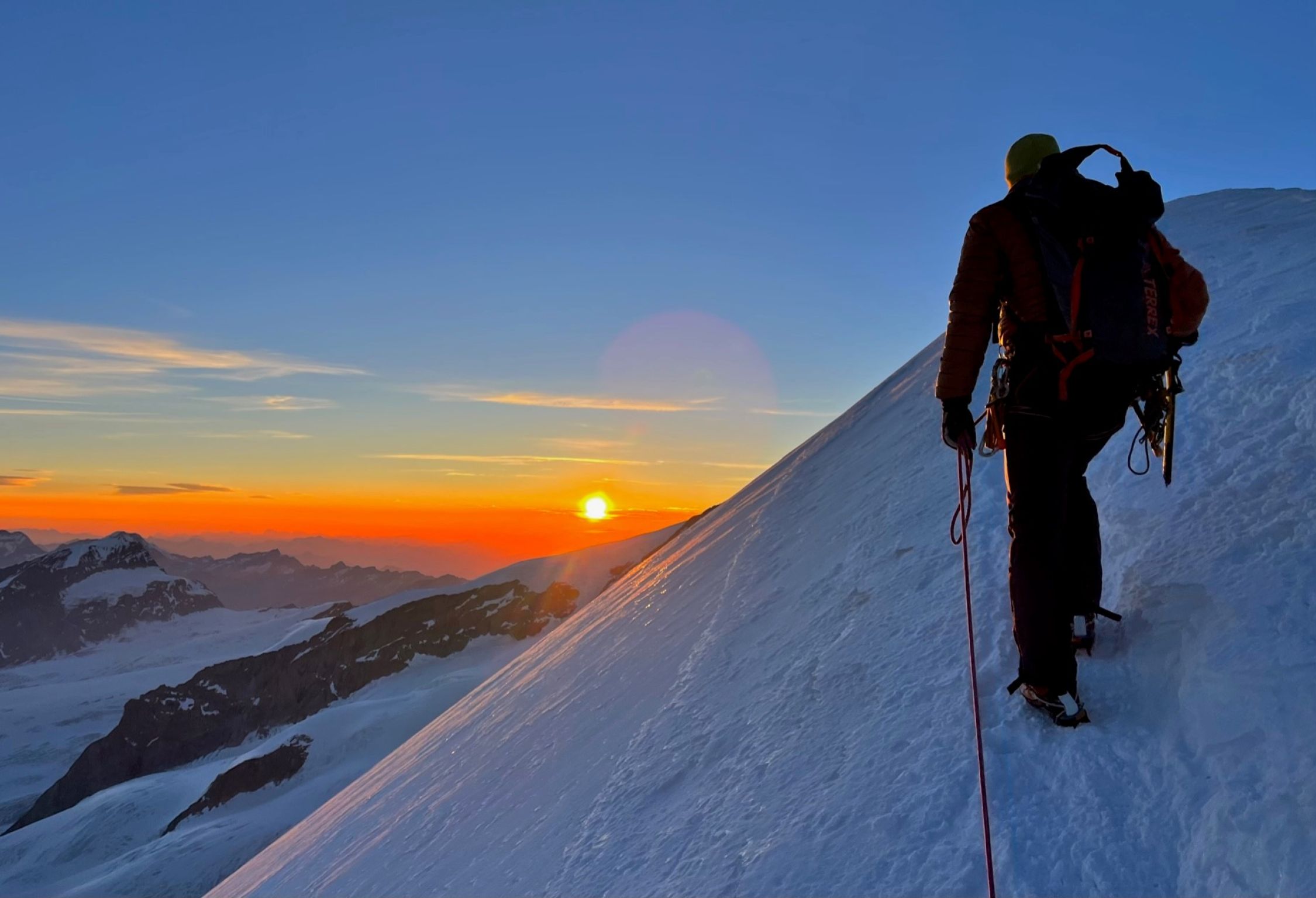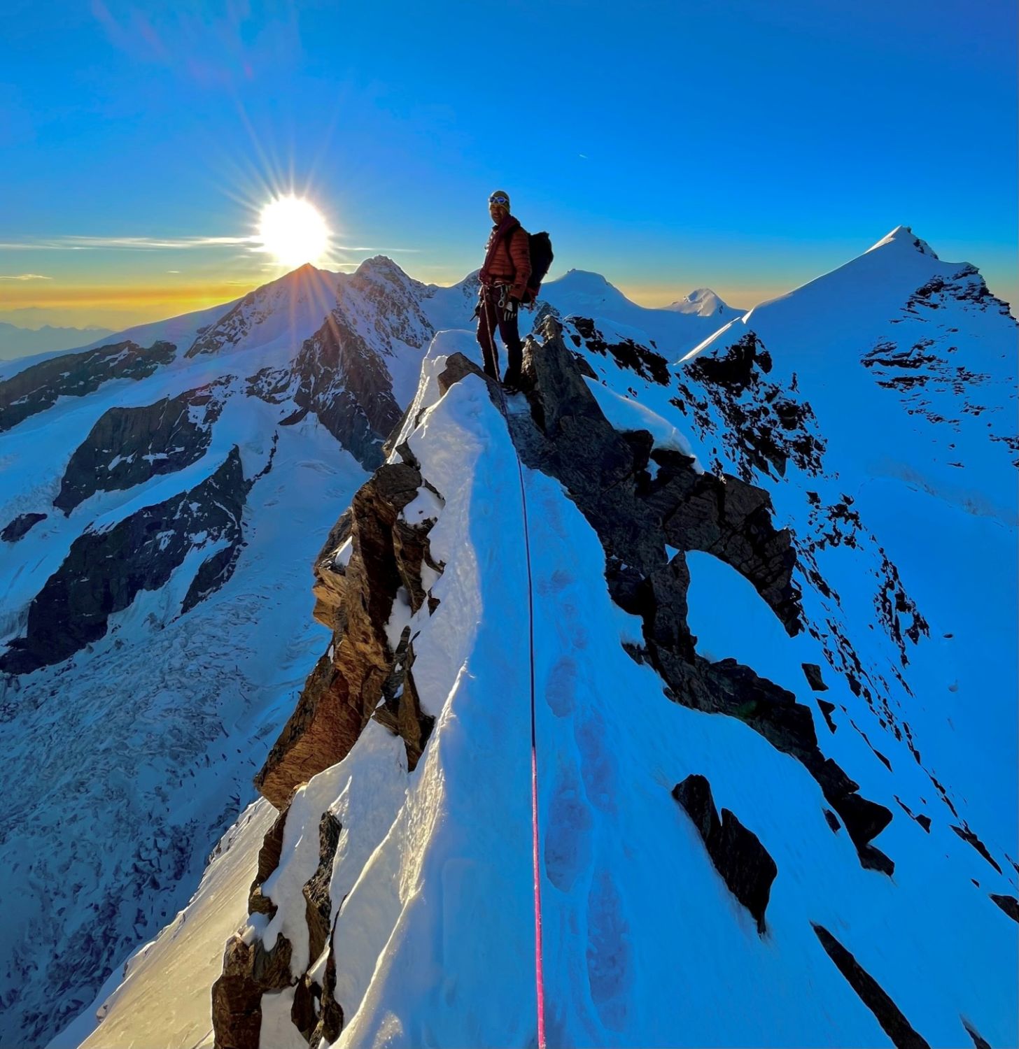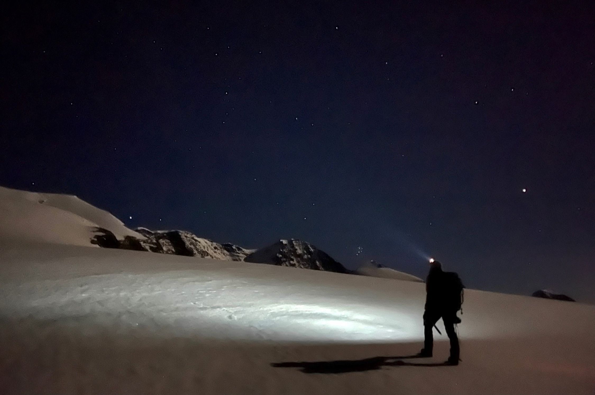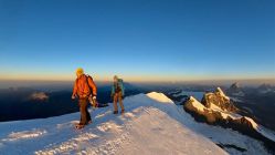 Da wir in der Nähe Rifugio Quintino Sella zelteten, konnten wir früh starten. Um 3.30 zottelten wir los Richtung Felikjoch. Der Felikgletscher ist schön zugeschneit und griffig zu laufen, wir zogen die Steigeisen erst kurz vor 4000 Meter an. Der Aufschwung zum Westgipfel ist noch mit gutem Trittschnee versehen, ein ausweichen auf den Felsen ist nicht nötig. Vom West- zum Ostgipfel ist eine sehr gute Spur vorhanden, teils aber schon bedenklich nah an der Wächte. In den nächsten Tagen ist es ratsam, teils eine neue Spur zu legen. Die "klettertechnische Schlüsselstelle" ist Schneefrei und trocken. Aus Bequemlichkeit haben wir kurz abgeseilt, was im Nachgang aber nicht nötig gewesen wäre. Abstieg vom Ostgipfel geht super, noch nichts blank. Jedoch um 7.20 bereits sehr bedenklich weich, hier hat die Sonne bereits gewirkt. Je früher desto besser. Ab Lisjoch auf "Autobahn" zur Bergsation Punta Indren.