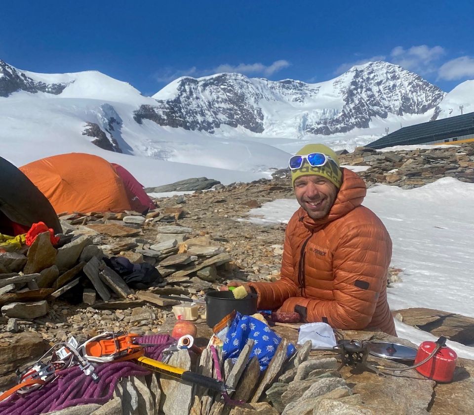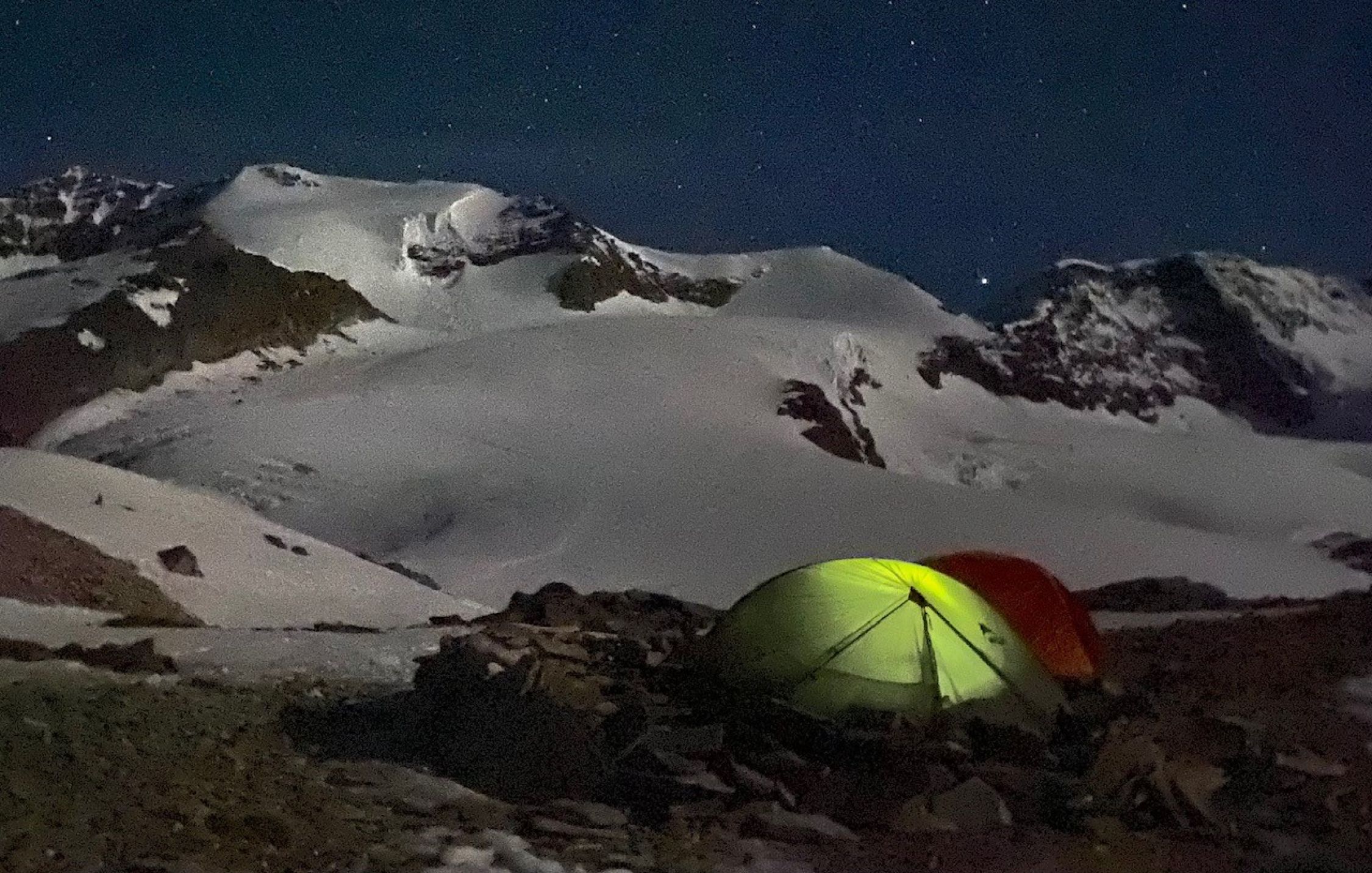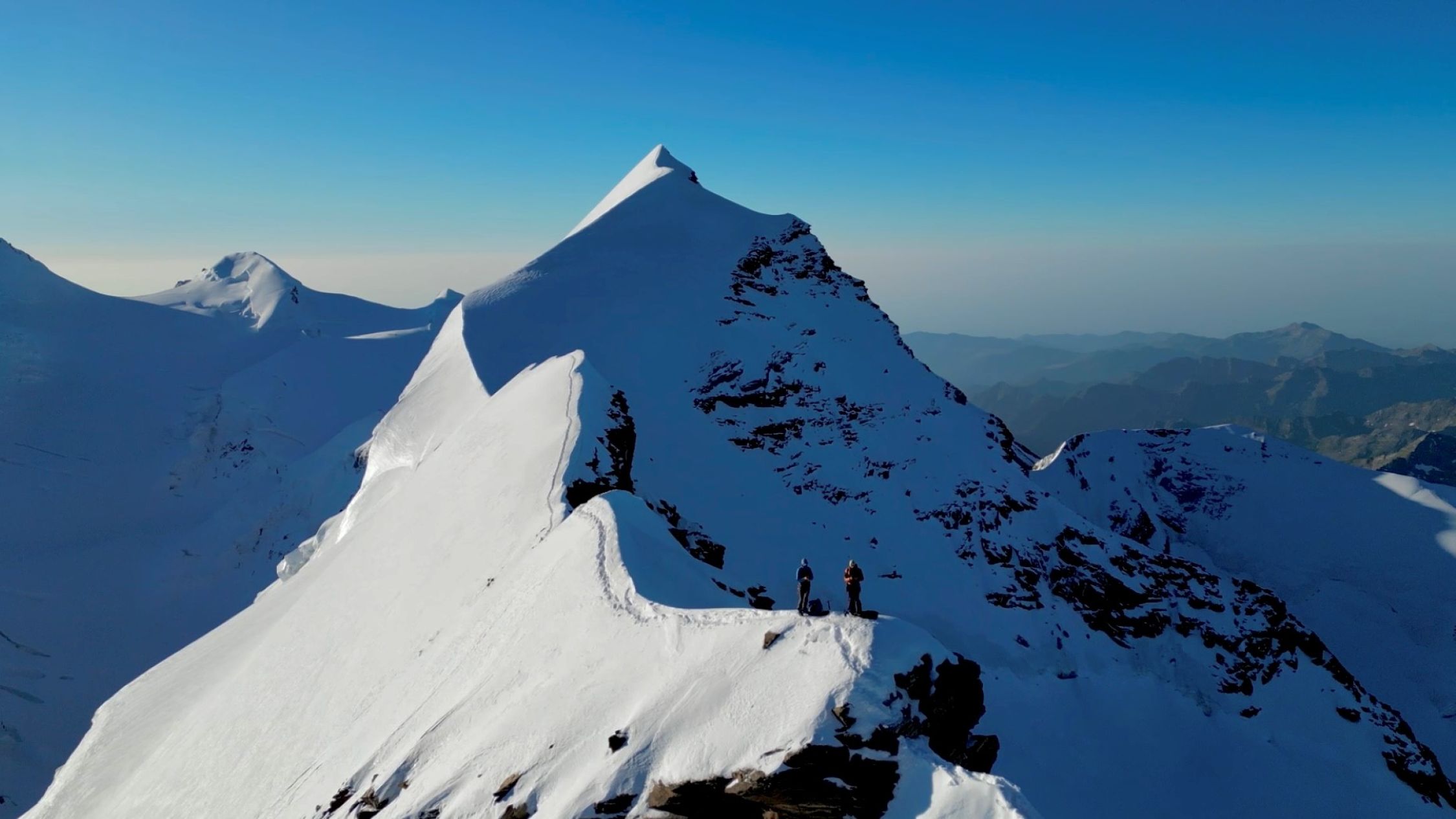 Da wir in der Nähe Rifugio Quintino Sella zelteten, konnten wir früh starten. Um 3.30 zottelten wir los Richtung Felikjoch. Der Felikgletscher ist schön zugeschneit und griffig zu laufen, wir zogen die Steigeisen erst kurz vor 4000 Meter an. Der Aufschwung zum Westgipfel ist noch mit gutem Trittschnee versehen, ein ausweichen auf den Felsen ist nicht nötig. Vom West- zum Ostgipfel ist eine sehr gute Spur vorhanden, teils aber schon bedenklich nah an der Wächte. In den nächsten Tagen ist es ratsam, teils eine neue Spur zu legen. Die "klettertechnische Schlüsselstelle" ist Schneefrei und trocken. Aus Bequemlichkeit haben wir kurz abgeseilt, was im Nachgang aber nicht nötig gewesen wäre. Abstieg vom Ostgipfel geht super, noch nichts blank. Jedoch um 7.20 bereits sehr bedenklich weich, hier hat die Sonne bereits gewirkt. Je früher desto besser. Ab Lisjoch auf "Autobahn" zur Bergsation Punta Indren.