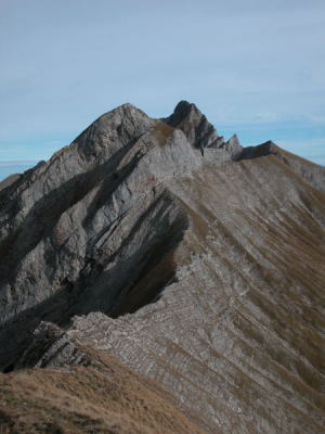 Zur Zeit sehr gute Bedingungen, da noch kein Schnee liegt, und die Felsen und das Gras trocken sind (bei Nässe sehr heikel). Ein 50m Halb- oder Zwillingsseil (1 Strang) genügt. Schwierigkeit insgesamt ZS (Fels bis V, dazwischen T4-T6+). Landschaftlich hervorragende Tour mit wunderschöner Rundumsicht auf Juraseen, Lac Léman, Mont Blanc, Alpes Valaisannes et Bernoises sowie Préalpes, die aber häufiger - z.B. ausgehend vom Vanil Noir - in umgekehrter Richtung gemacht wird (daher die vielen Abseilstellen) - die beiden Seillängen an Carré und Paray sind, ehrlich gesagt, chly ne Morx gsi...