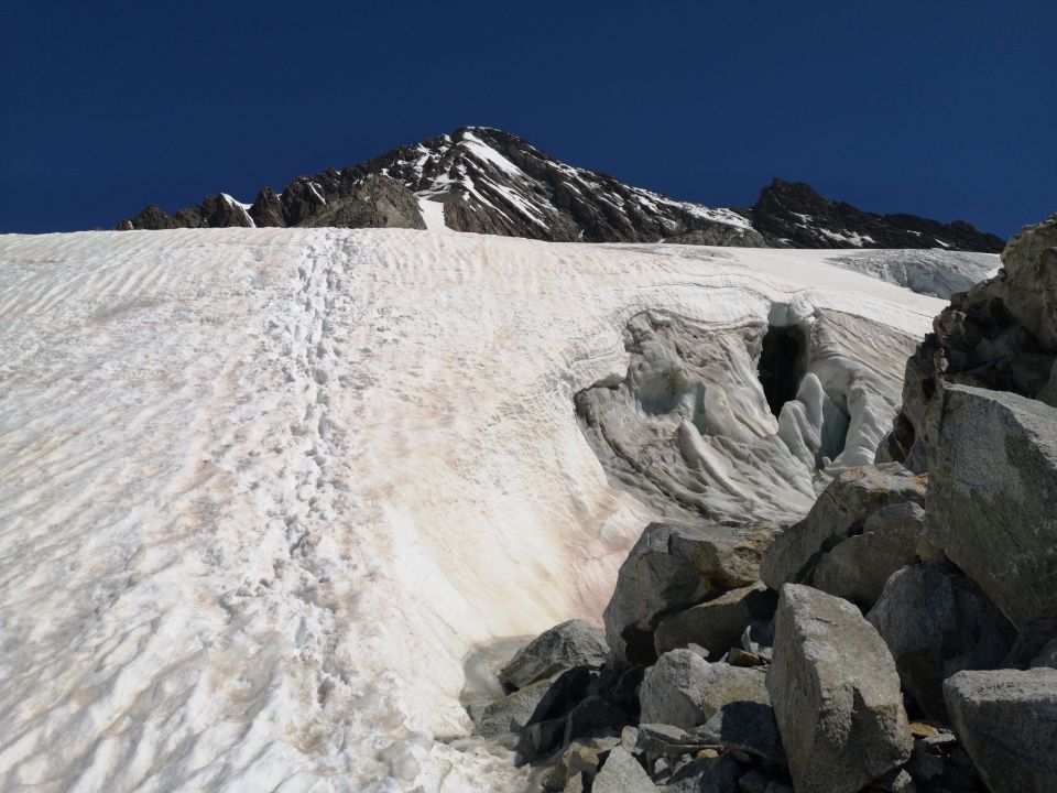 Ab Punkt 3394 Schnee auf Gletscher, der nach Sonneneinstrahlung schnell zu sulz wird. Gletscherspalten grösstenteils noch zugedeckt. Kann bei spätem Abstieg heikel sein.