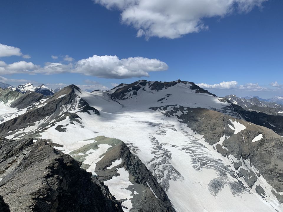 Die Tour ist eher als leichte Wanderung zu bezeichnen, obgleich man doch ordentliche Höhen erreicht. Ich habe die Pointe de Darbonires und den Mont de l‘Etoile noch mitgenommen. Interessantes „Mondgelände“. Es hat mich zufem interessiert, ob man von der Pointe de Darbonires direkt über den Nordgrat zur Aiguille Rouges d‘Arolla (Nordgipfel!) steigen kann. In der Literatur fand sich dazu nichts. Die Steilheit ist mässig, das Gelände besteht aber aus schwarzen, schliffrigen Schutt, absolut miserables Terrain. Da ist der übliche Zustieg zwischen Zentral- und Nordgipfel dann wohl die sinnvollere Alternative.