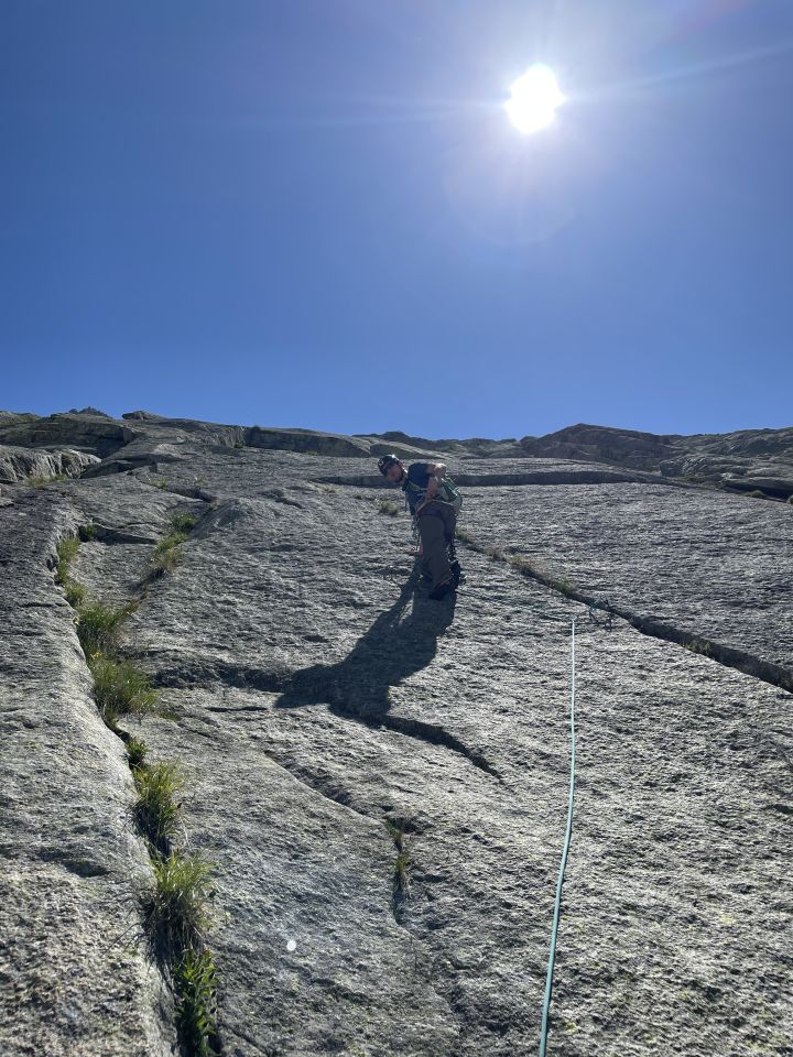 Im oberen Bereich wegen Schneefeldern noch etwas nasser Fels, wobei die Route nicht wirklich davon betroffen war. Für den Abstieg ist ein gut markierter Wanderweg ca T3+ vorhanden. Es kann aber auch noch auf der Route "Kreuzbandweg" bis zum Vorgipfel weitergeklettert werden. Von da muss man allerdings 45m abseilen.