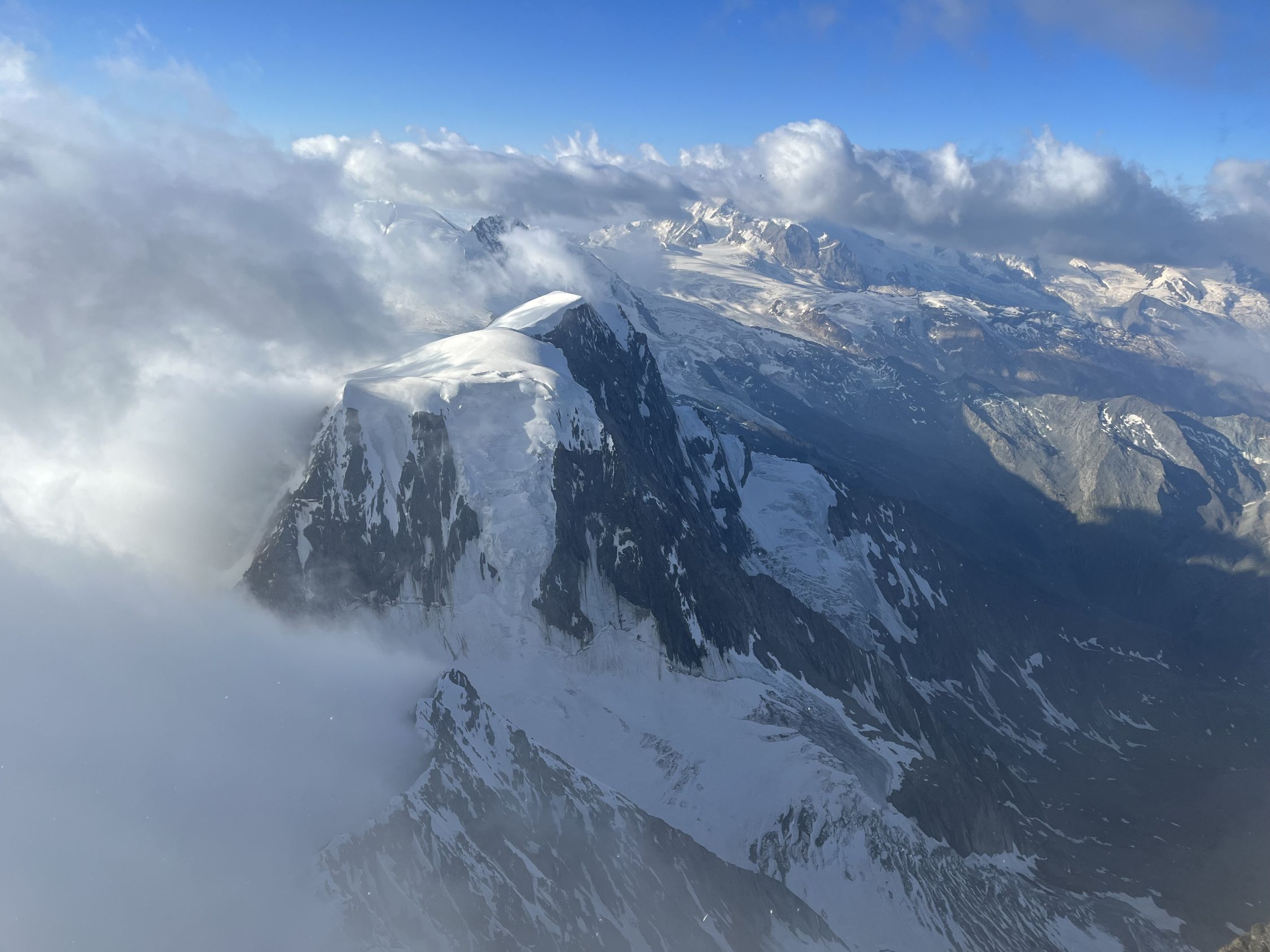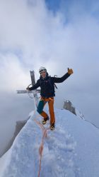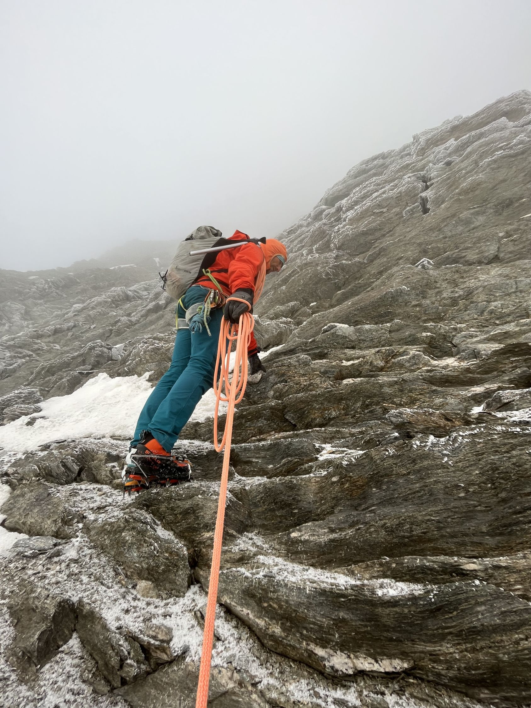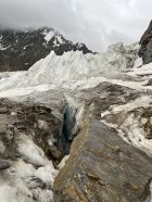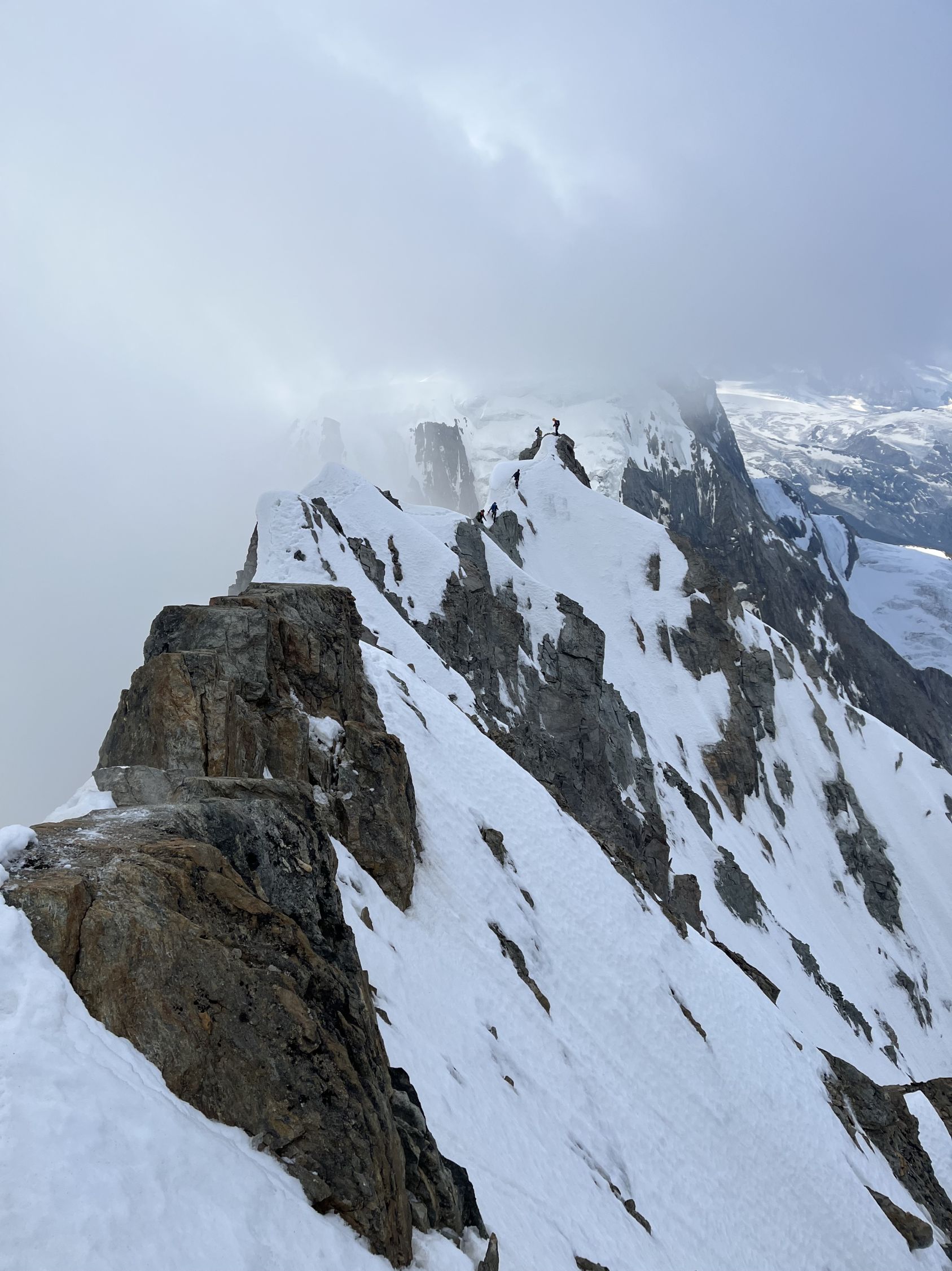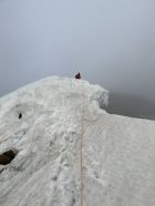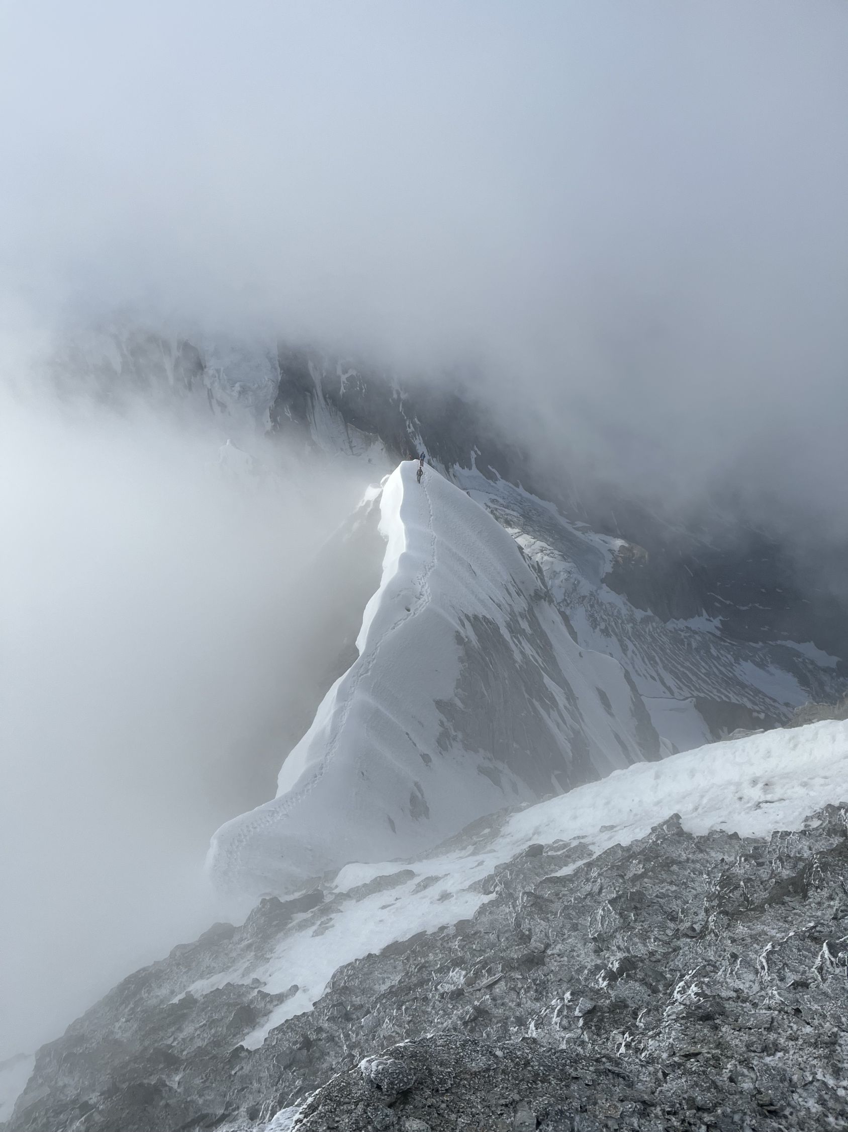 2. Aufstieg zum Gipfel: es gibt etliche Steinmänner auf der Route, die v.a. im unteren Bereich die Pfadsuche erleichtern. Im unteren Teil des Grats führt der richtige Pfad teils in die Ostflanke (nicht zu weit in die Flanke abklettern!), was vor dem starken Südwestwind schützt. Ab ca. 4'000m montiert man die Steigeisen, denn es gibt viele Schneereste auf dem Grat, die zum Teil verwechtet sind. Der Schnee ist jedoch hart und griffig, hält sich teilweise auf steilen Abschnitten fest. Der obere Bereich des Gipfelaufbaus ist trotz der Hitze im Tal vereist. Die Vereisung stört nicht gross, auch nicht im steilen Gipfelzustieg.