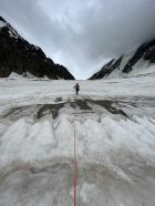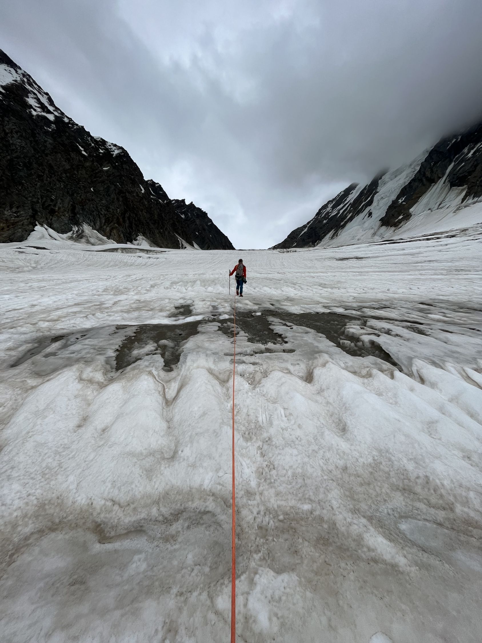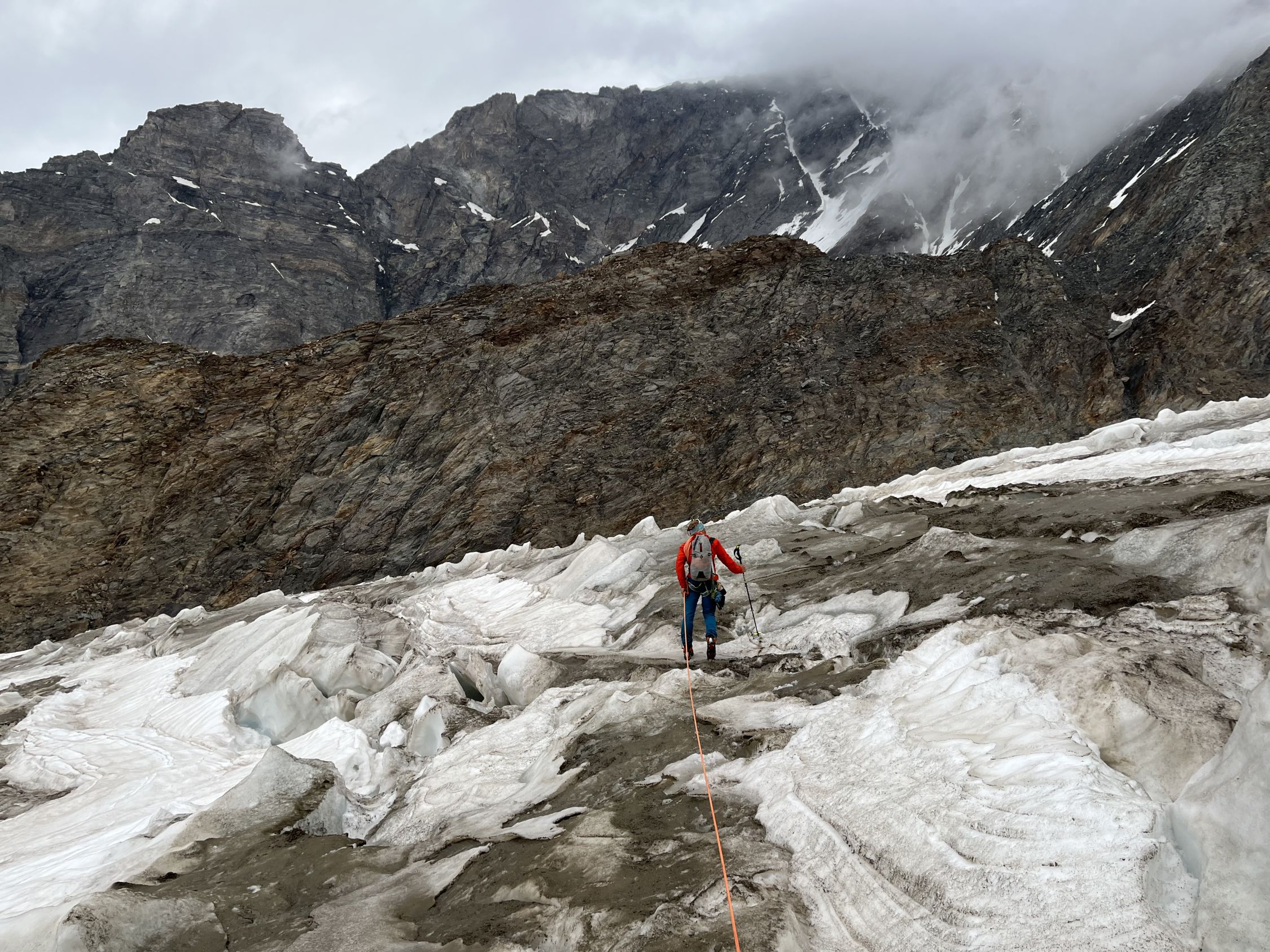 1. Zustieg zum Mischabeljochbiwak: man avisiert den P. 3478, in dessen Nähe ein markanter Steinmann steht, und bindet dort Steigeisen an. Der Weingartengletscher ist sehr zerfurcht. Viele Spalten sind noch durch den Winterschnee zugedeckt. Dieser bietet einerseits Brückenmöglichkeiten, anderseits verdeckt er aber das Risiko eines Spaltensturzes. Auf dem Gletscher geht man bei den momentanen Verhältnissen in etwa so: man hält sich nach dem Einstieg am südlichen Rand bis ca. 3'600m. Dann sucht man im Spaltenlabyrinth nach einem geeigneten Travers zur gegenüberliegenden (nördlichen) Seite des Gletschers, und wenn man ihn überquert hat, peilt man den Biwak an. Der Gletscher wird flacher und spaltenarmer. Beim Abstieg braucht man auf diesem Abschnitt die Steigeisen nicht.