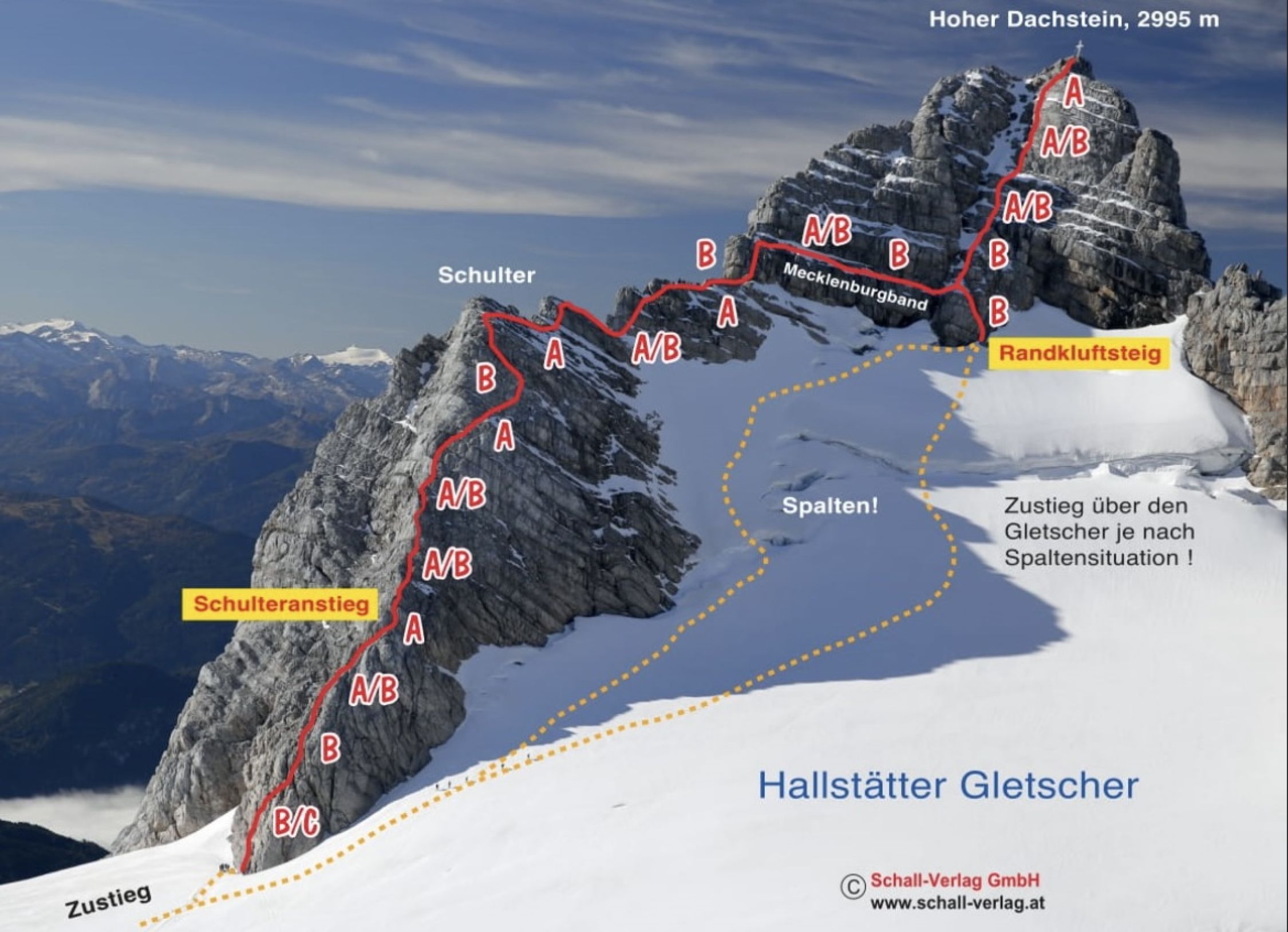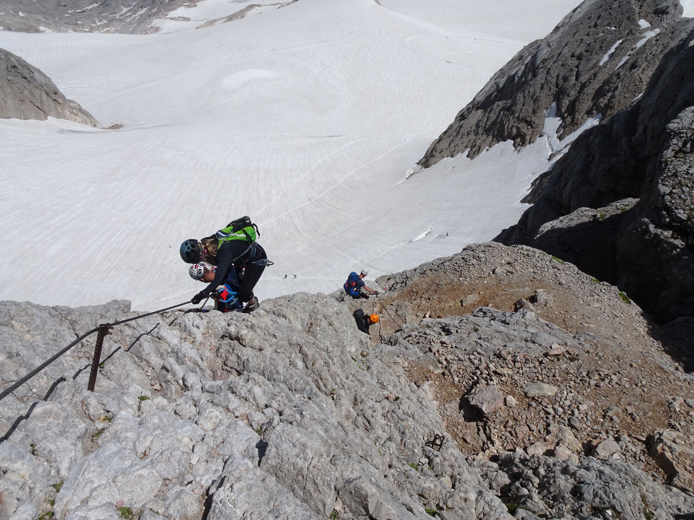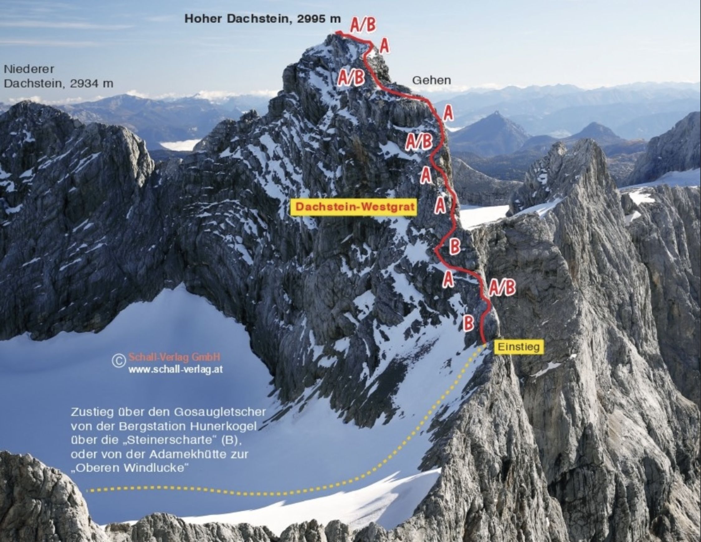 Ich bin folgende Route gegangen: Hunerkogel - Steinerscharte - Obere Windluke - Westgrat - Hoher Dachstein - Randkluftsteig - Mecklenburgerband - Schulteransteig - Seethalerhütte - Hunerkogel