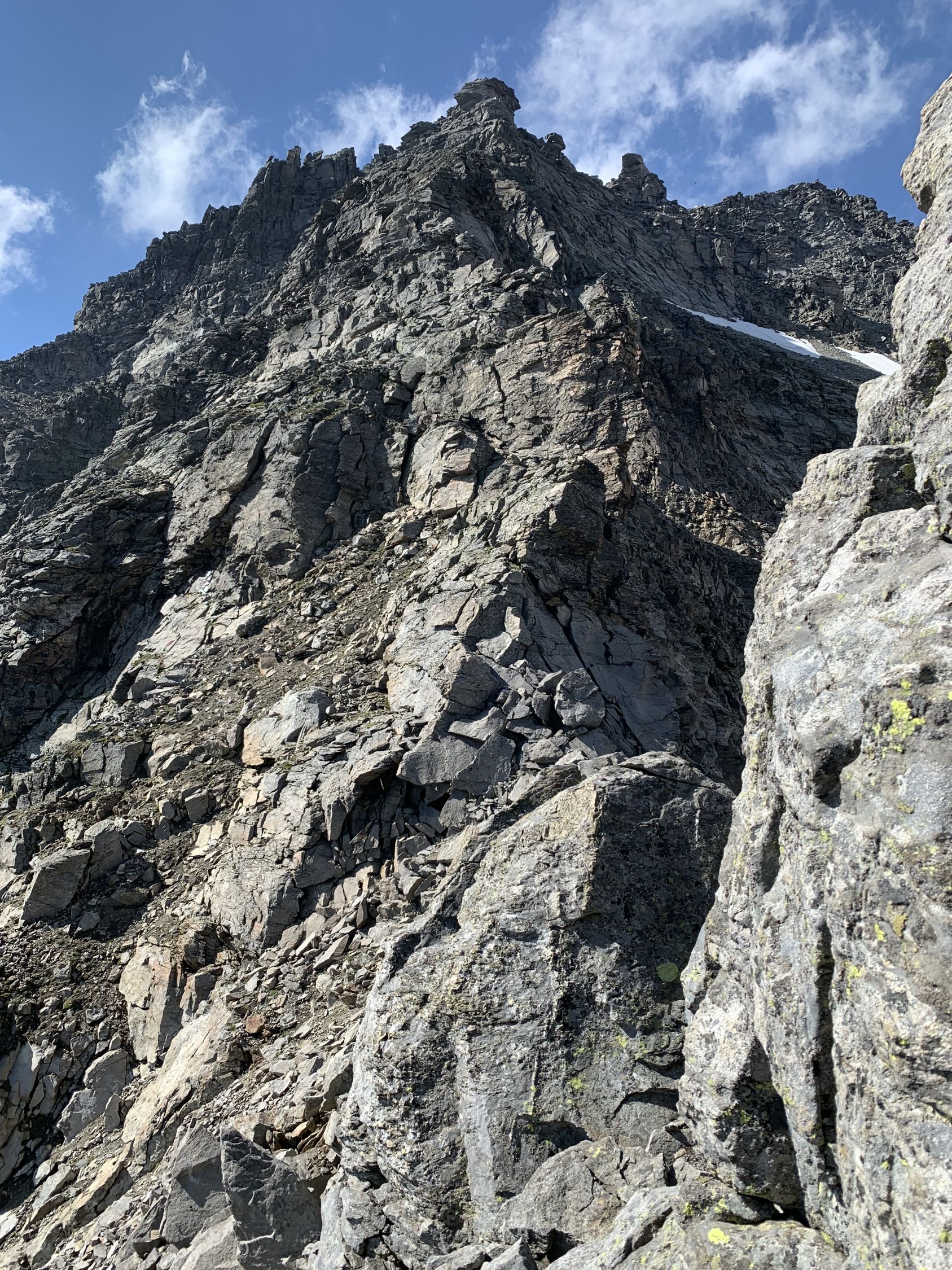 Aufstieg im brüchigen Gestein. Eine klare Routenführung ist nicht gegeben, Man muss selber suchen. Meist auf dem Grat, es ergeben sich viele Möglichkeiten die alle in etwa gleich sind. Die zwei roten Türme überklettern. Der Graue auch etwas rechts davon. Der Rote Turm kann rechts umgangene werden. Je nach dem Steigeisen notwendig. Danach wird das Gestein besser. Nicht zu Beginn in die linke grosse Rinne hoch, die ist zu brüchig. Sondern etwas links am Grat bleiben bis zum Gipfel. Abstieg Normalroute mit guten Trittspuren. Steigeisen von Vorteil.