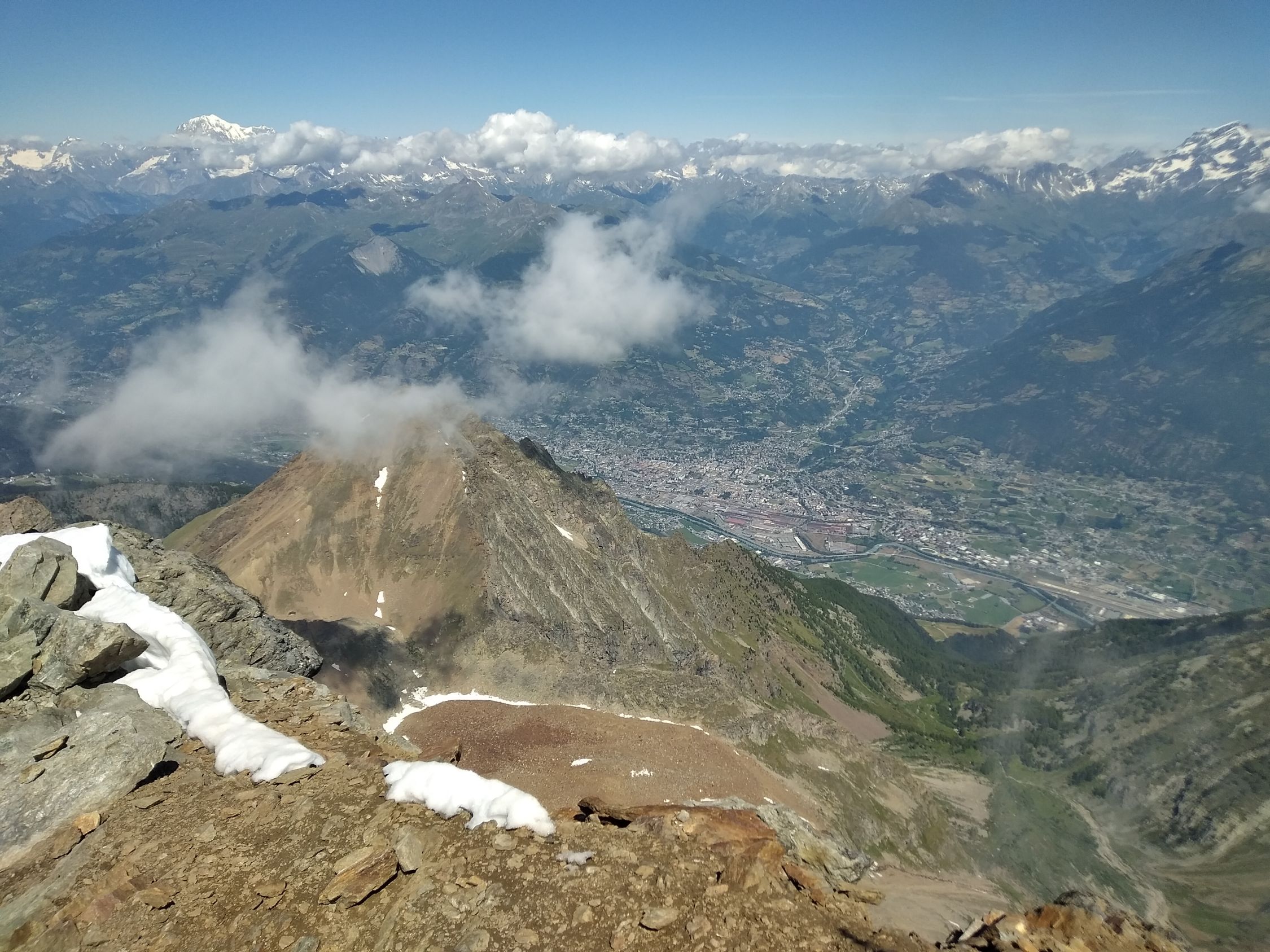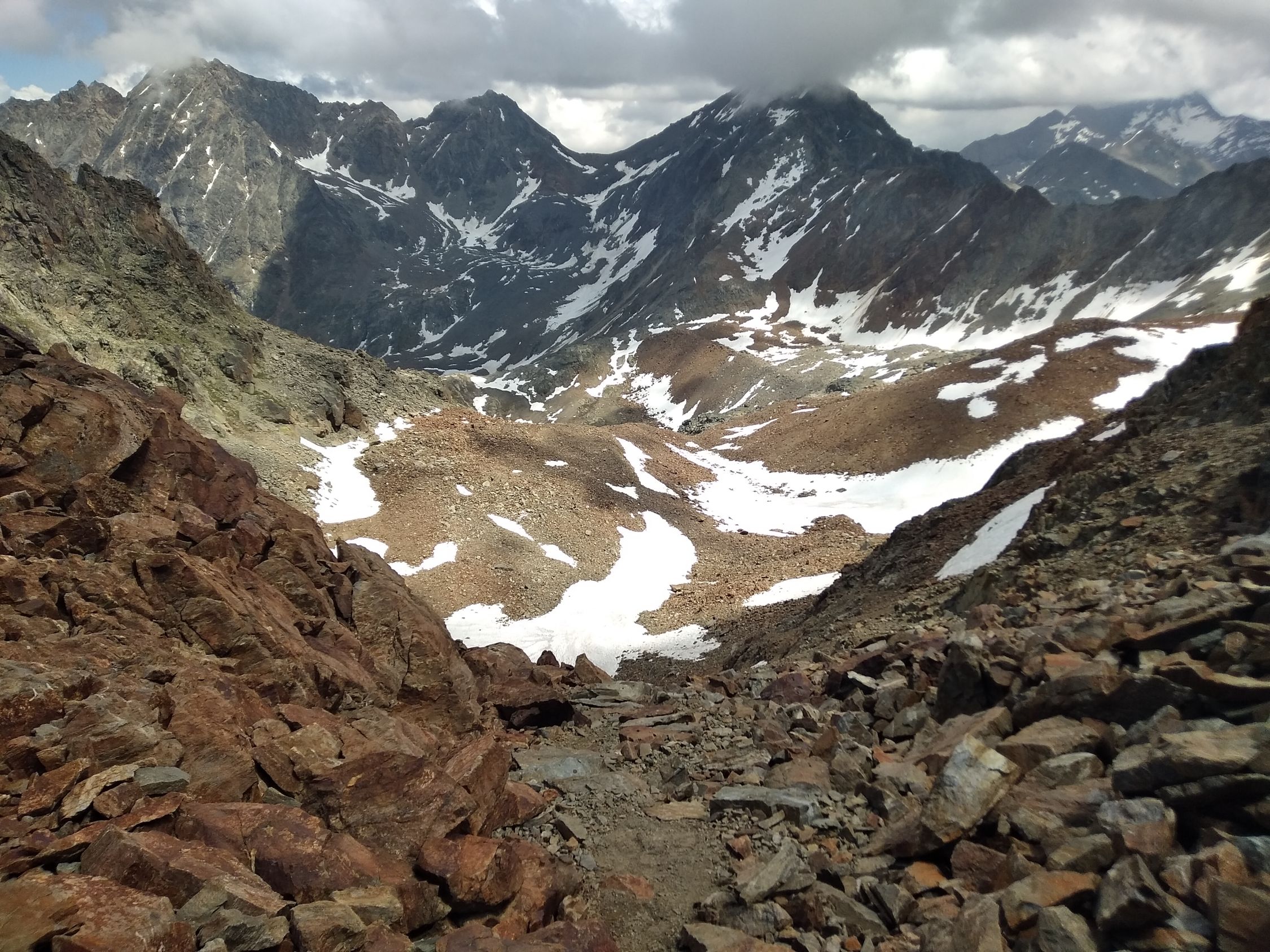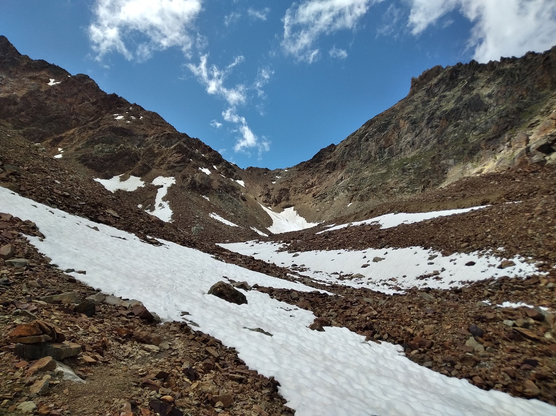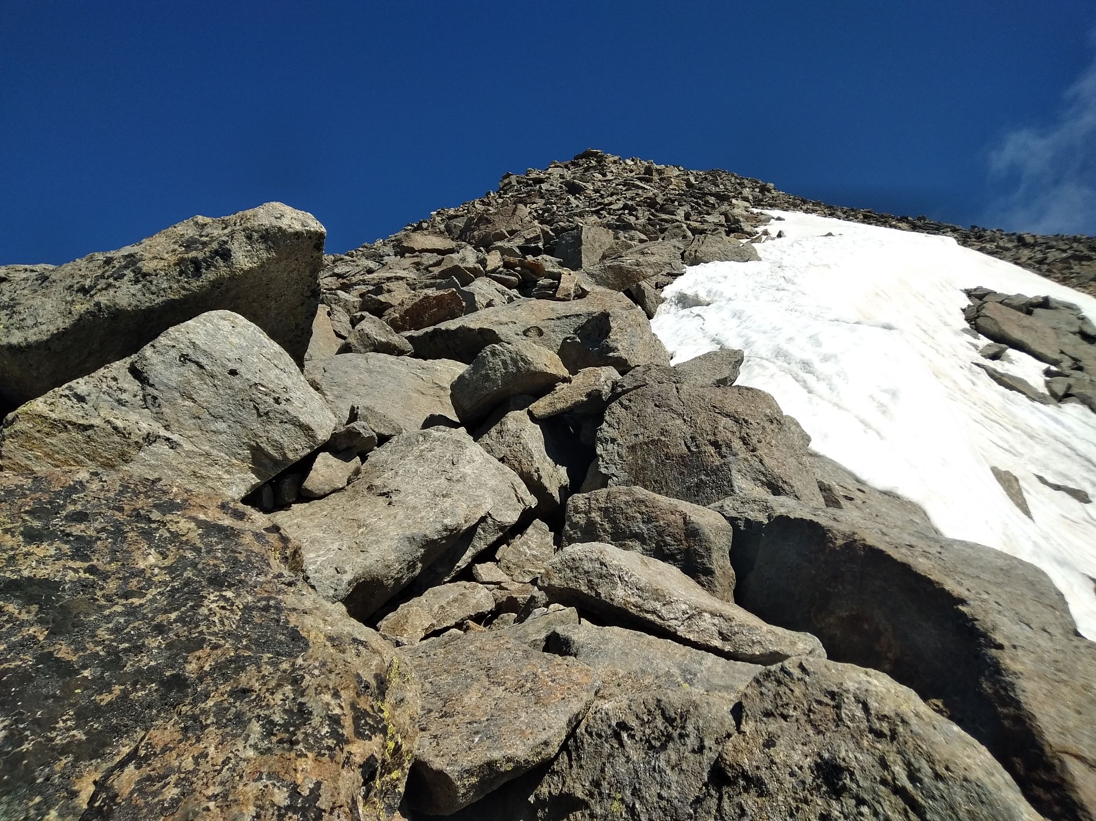 Es hat noch einige Schneefelder. Es ist sicherer in den Blöcken auf dem Grat zu klettern als der Wegspur folgen.