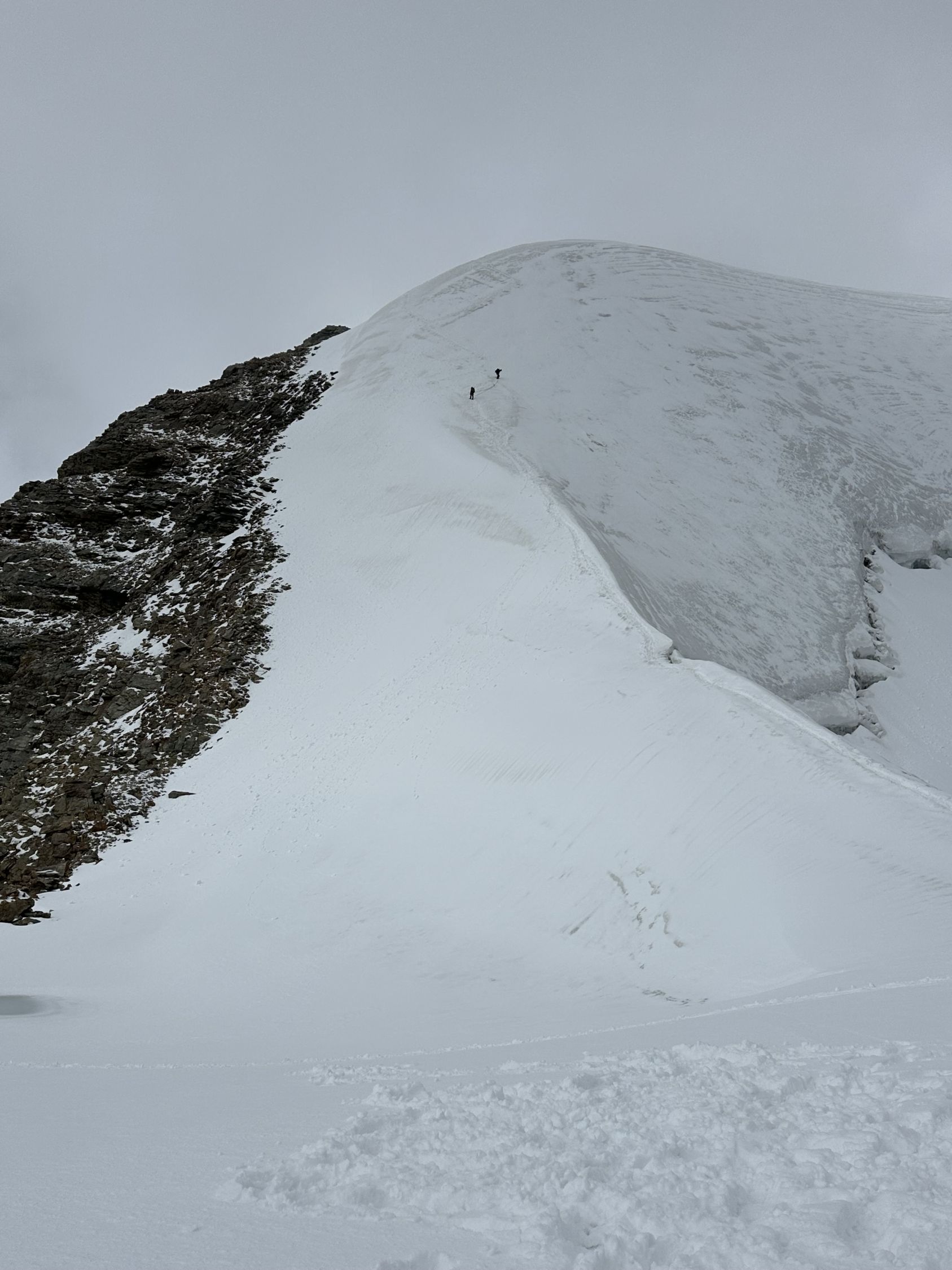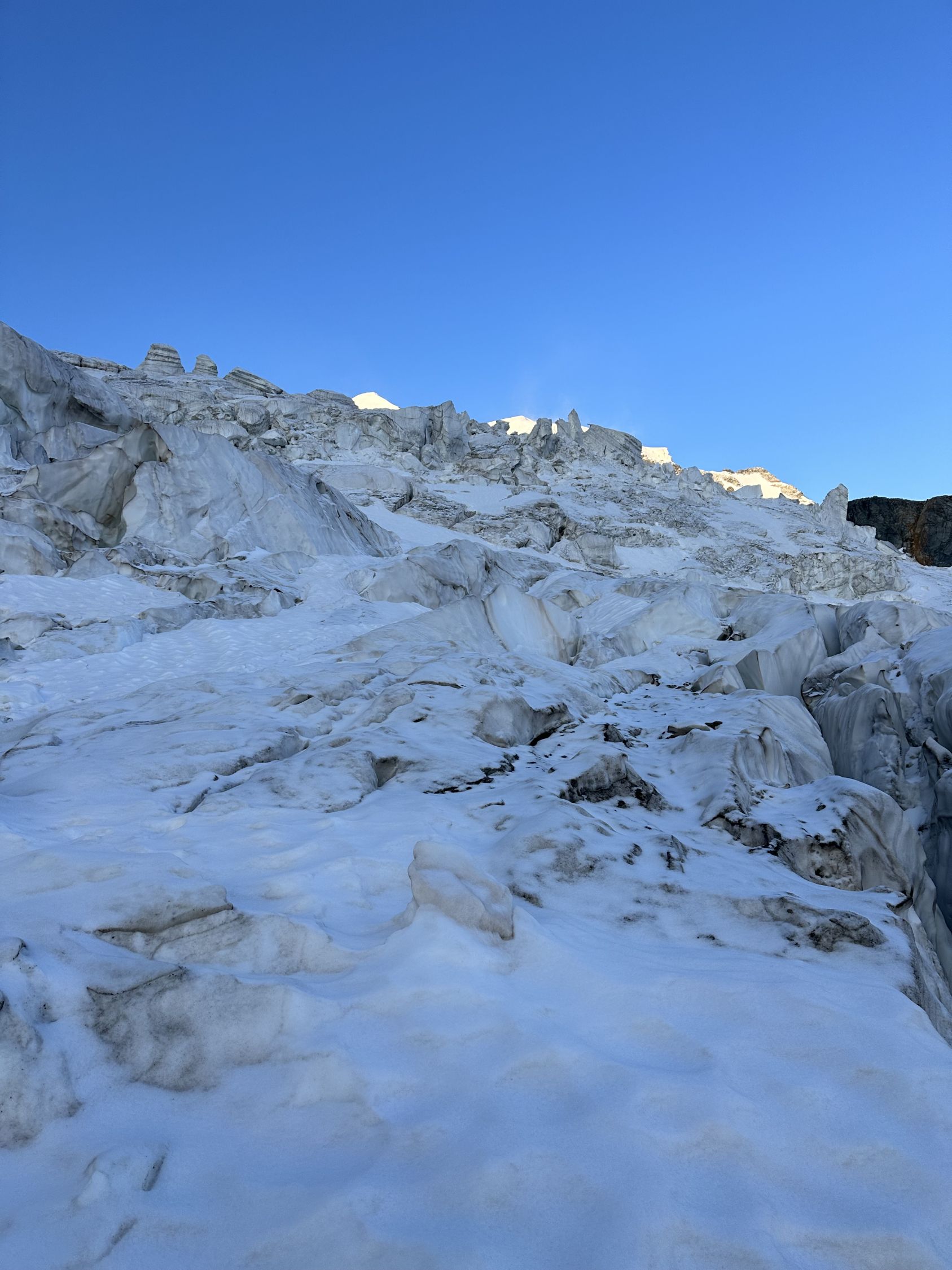 Sehr gute Spur durch den Gletscherbruch. Allerdings sind nicht mehr alle Spaltenbrücken in guten Zustand, insb Vorsicht beim Abstieg (möglichst früh dran sein) - sind bereits um 11Uhr einmal eingebrochen.
