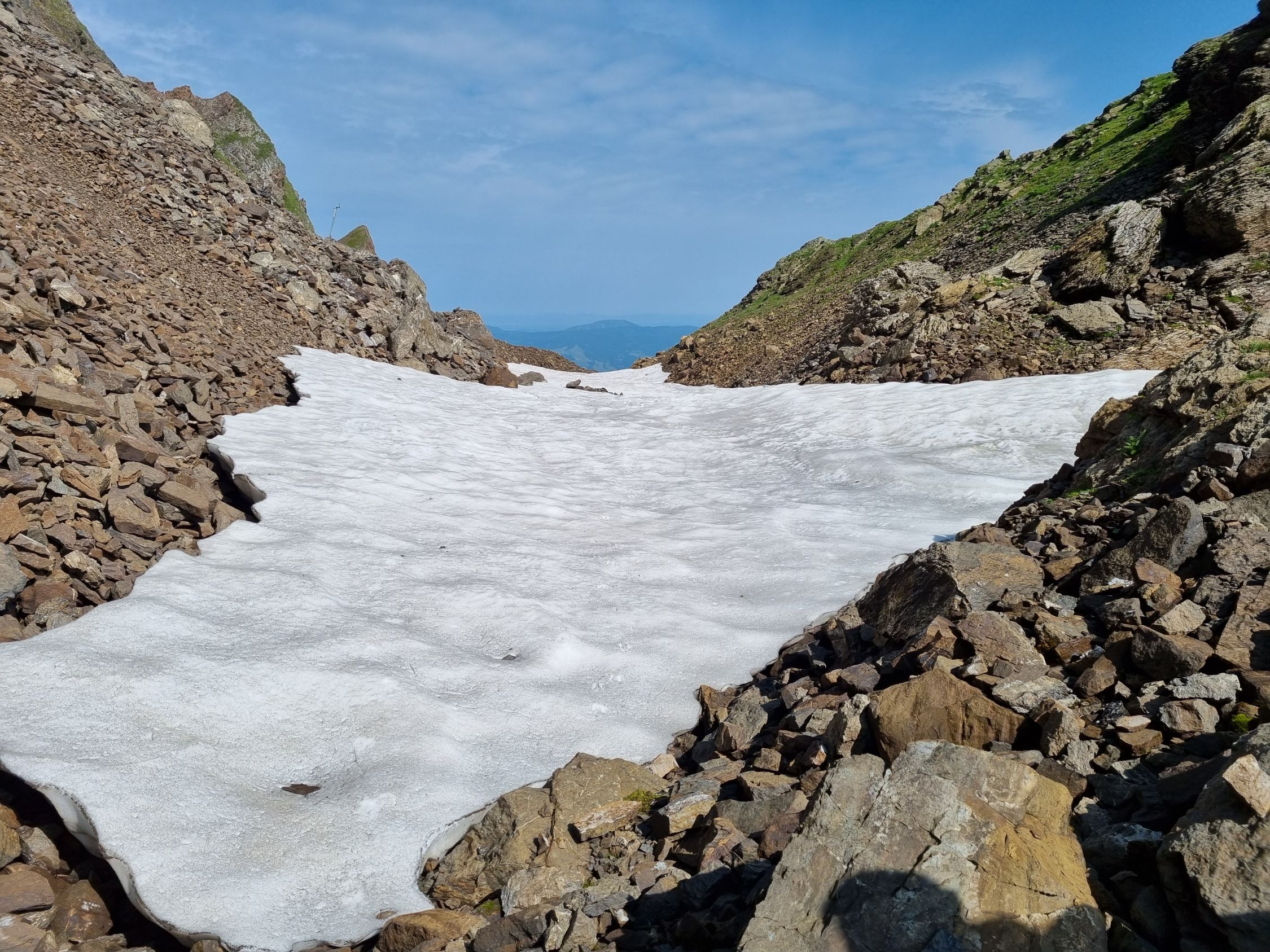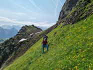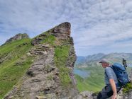 Eine Stelle im Abstieg richtung Metzgerchäle im Gras kurz etwas feucht, aber problemlos. Vorsicht beim Klettern im Aufstieg zum Glogghüs. Der Fels ist nicht immer so stabil wie er aussieht. Hatte zwei Griffe gleich in der Hand.