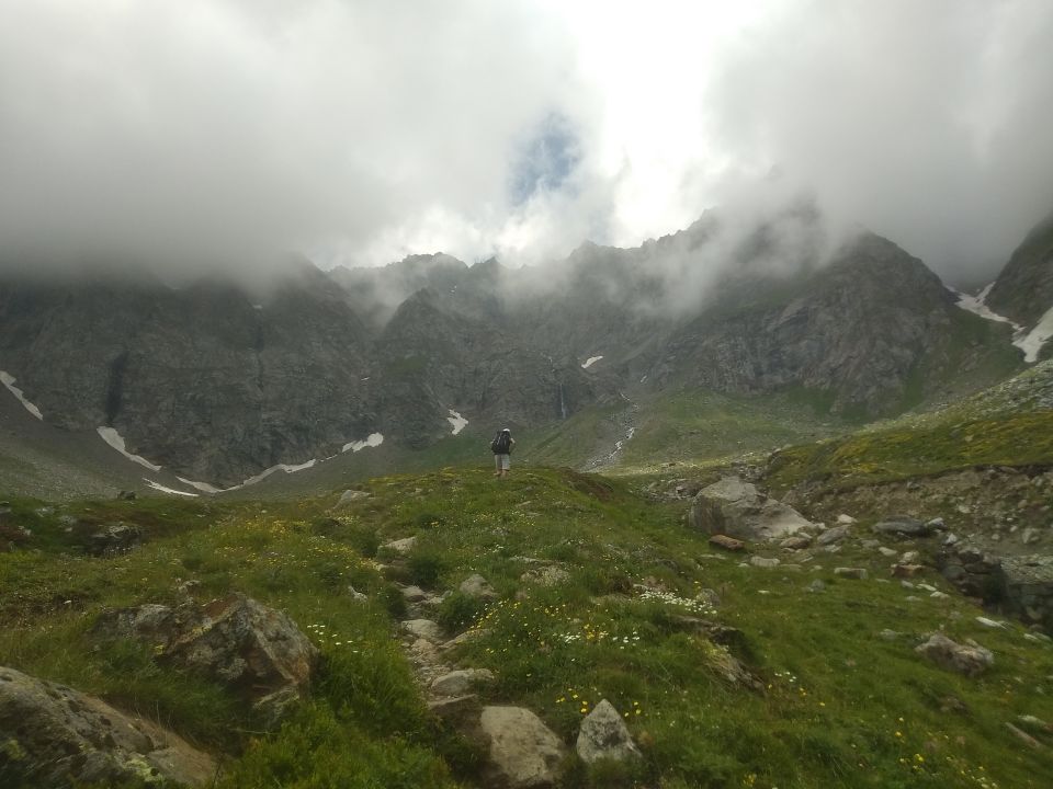 Noch Schnee im Ost-Couloir des Passes. Am frühen morgen wenn Schnee noch hart Steigeisen hilfreich.