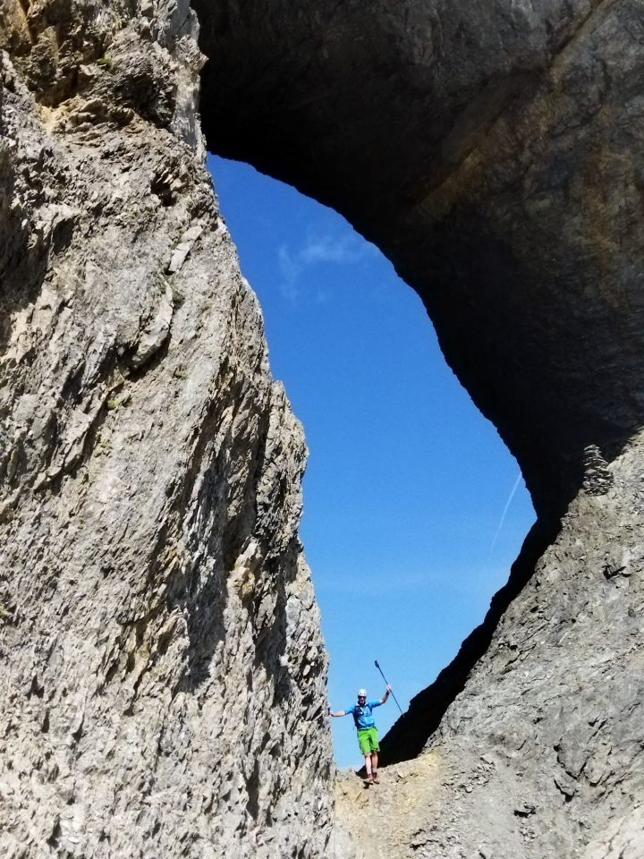 Top Verhältnisse, wenn man denn Schutt und Geröll liebt. Wir sind von Süd nach Nord durch das Loch, 2 x 20m Abseilen, ein Helm und ein Gehstock hilft für diese Tour. Vorsicht auf Steinschlag durch andere Alpinisten.