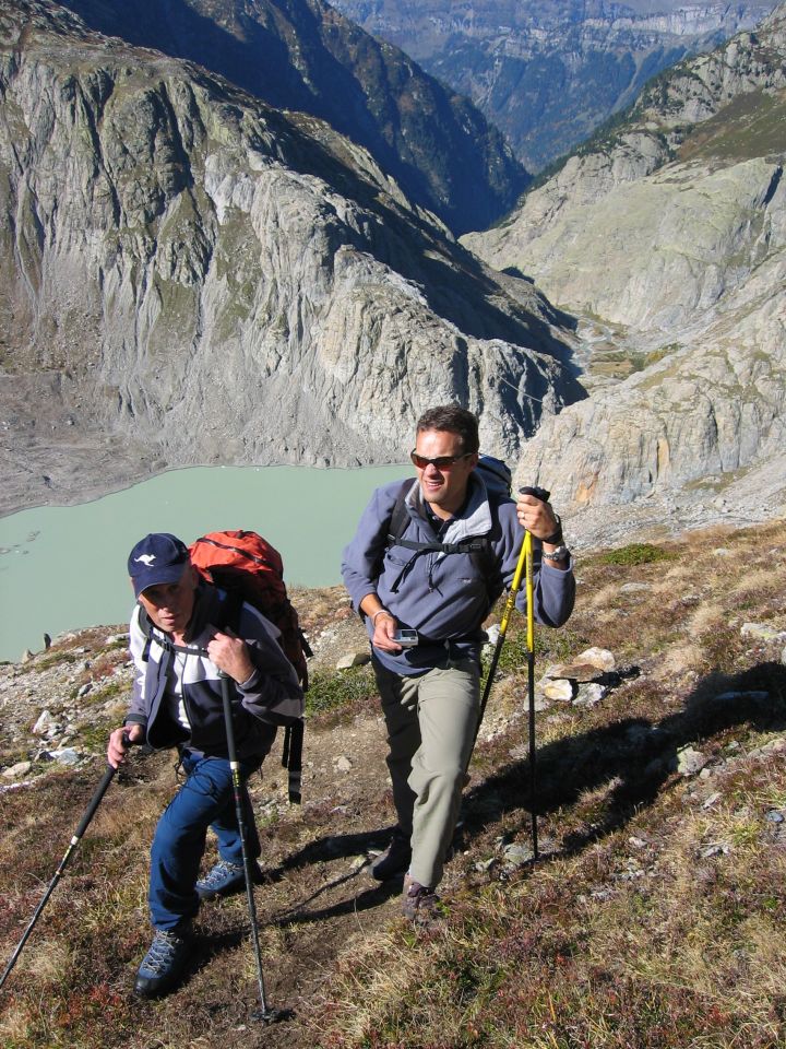 Von Fuhren rechts über die Triftschlucht zum Gletscherseeli hinauf. Die lange Hängebrücke überquert und über zwei weitere Stahlleitern Richtung Trifthütte gewandert . Ab 2000 Metern lag stellenweise gefrorener Schnee das war uns zu risikoreich wir haben die Wanderung auf 2300 Metern abgebrochen. Zurück zur Hängebrücke und der Windegghütte noch einen Besuch abgestattet Zur Triftseilbahn hinauf und mit ihr nach Führen zurück.